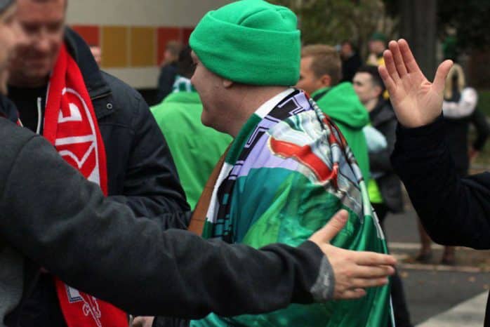 Um 16.44 Uhr setzten sich die Celtic-Anhänger schließlich in Bewegung. Auf der Route durch das Zentrum-Nord und das Waldstraßenviertel zündeten die Grün-Weißen immer wieder Bengalos und intonierten Klassiker wie die „Celtic Symphony“, „The Boys oft he Old Brigade“ und natürlich den Oasis-Hit „Can`t get enough“. In Sachen Support hatten die Schotten auch im Stadion die Nase vorn, was in Anbetracht der vergleichsweise leisen Leipziger Fankurve nicht verwunderte. Dass die Gäste zu Beginn der beiden Halbzeiten reichlich Pyrotechnik abbrannten, war selbst für Stammgäste etwas Ungewöhnliches.
