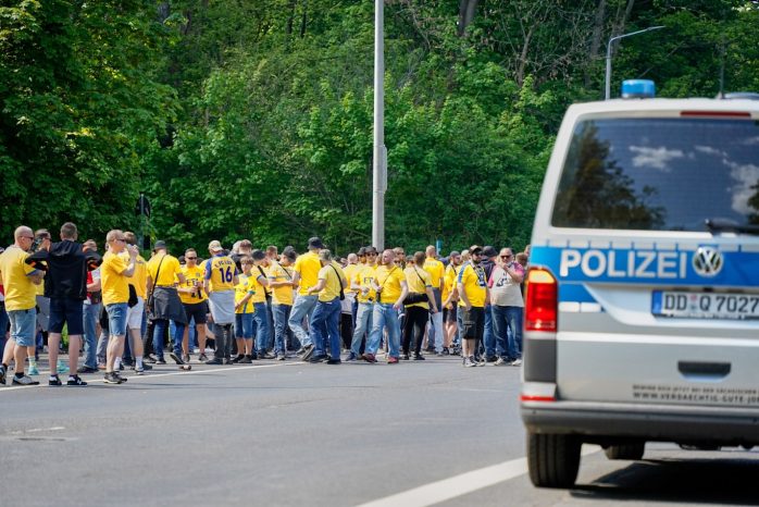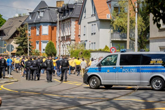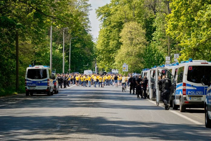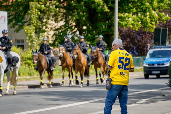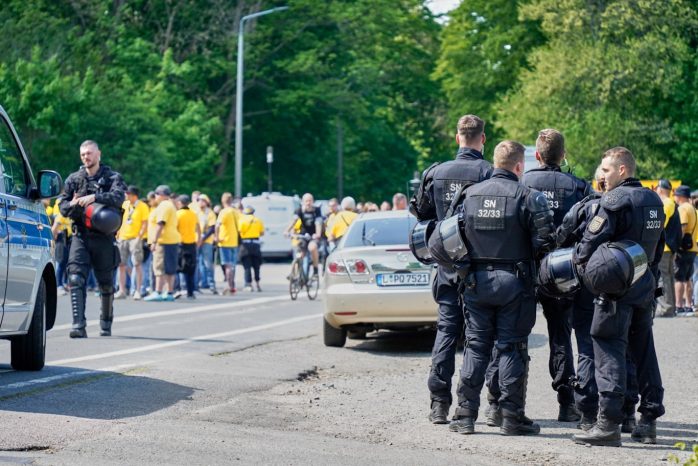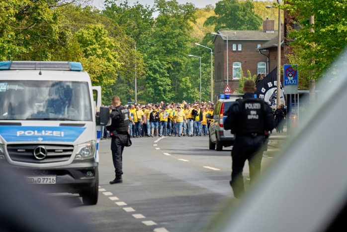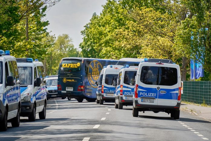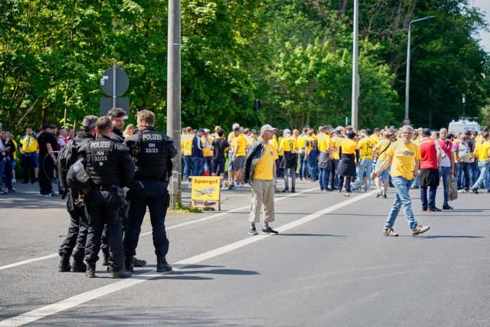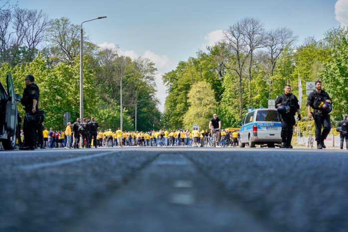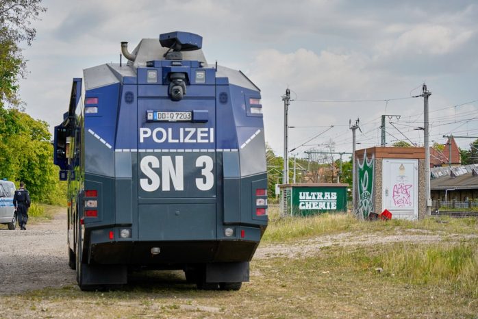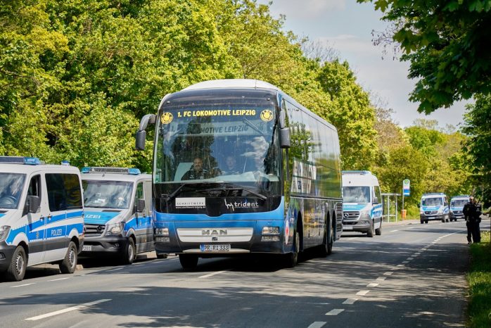 Auf der Gegenseite gelang es einer Handvoll vermummter Chemie-Fans, vom Norddamm aus aufs Spielfeld zu laufen. Polizei stürmte ins Stadioninnere, riegelte an der Mittellinie ab. Ein weiteres Polizeiaufgebot zog vor dem Gästeblock auf, um eine Eskalation zu verhindern.