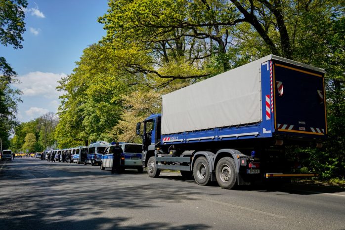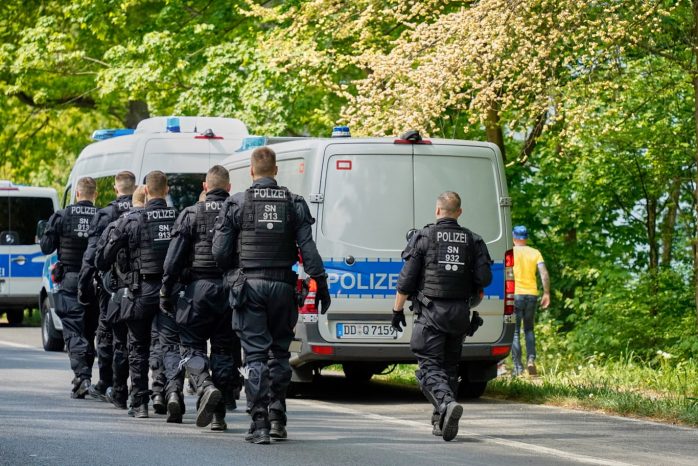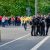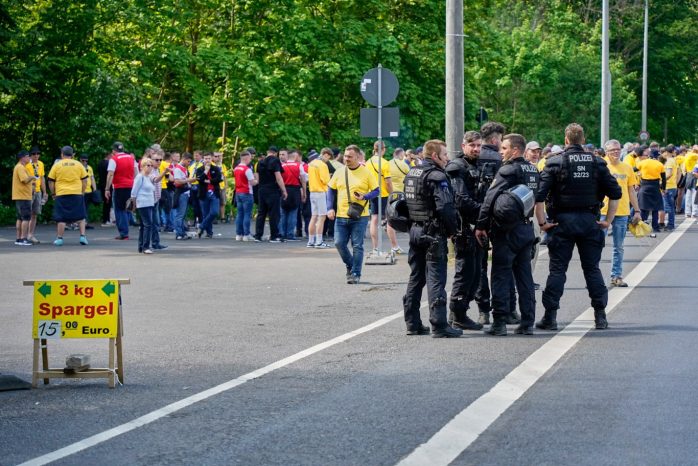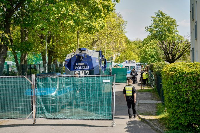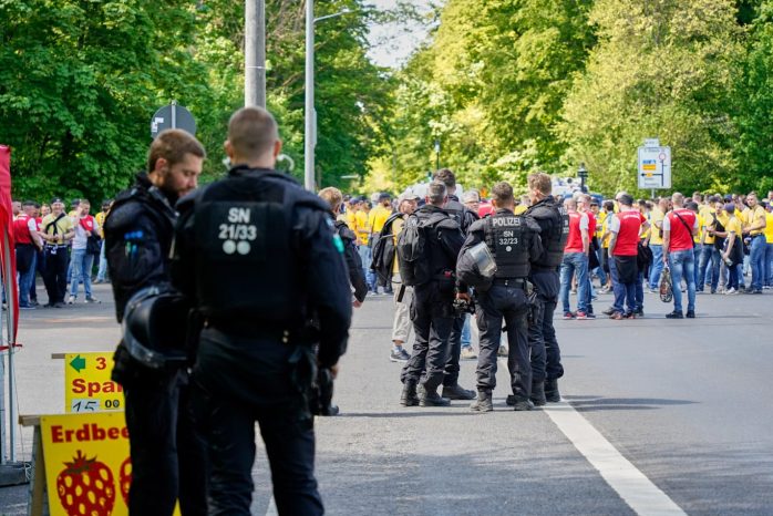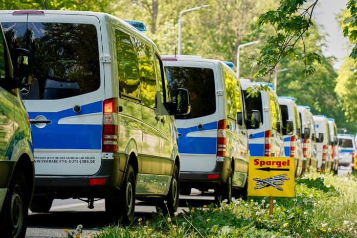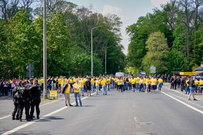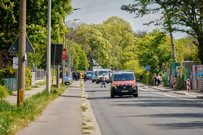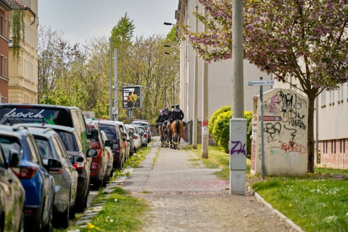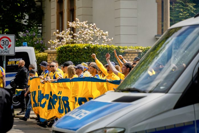 Auf der Gegenseite gelang es einer Handvoll vermummter Chemie-Fans, vom Norddamm aus aufs Spielfeld zu laufen. Polizei stürmte ins Stadioninnere, riegelte an der Mittellinie ab. Ein weiteres Polizeiaufgebot zog vor dem Gästeblock auf, um eine Eskalation zu verhindern.
