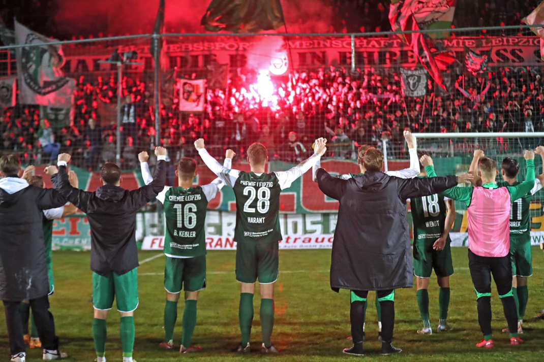Zum Auftakt des 8. Spieltags der Regionalliga Nordost, sorgte die BSG Chemie für ein dickes Ausrufezeichen. Im letzten Spiel mit dem etwas funzligen provisorischen Flutlicht und vor 4.999 Zuschauern im ausverkauften Alfred-Kunze-Sportpark, fuhren die Grün-Weißen ihren fünften Liga-Sieg in Folge ein und verpassten dem FC Carl Zeiss Jena damit dessen erste Saisonniederlage. Damit parken die Leutzscher mindestens für einen Tag auf dem 2. Tabellenplatz.