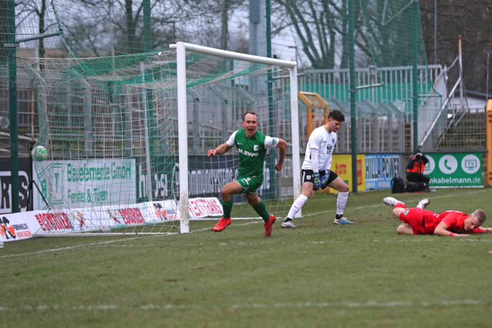 Manasse Eshele spielt den Ball in der gegnerischen Hälfte auf Timo Maurer, der etwa 23 Meter zentral vorm Tor steht. Der passt links raus zu Dennis Mast und läuft weiter Richtung Sechs-Meter-Raum. Dort bekommt er das Leder von Mast zurückgespielt und vollendet trocken ins linke, kurze Eck. Torwart Luis Klatte war chancenlos. Zehn Minuten nach seinem Treffer musste der Torschütze wegen eines schmerzhaften Schlags aufs Knie allerdings ausgewechselt werden.