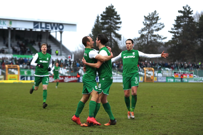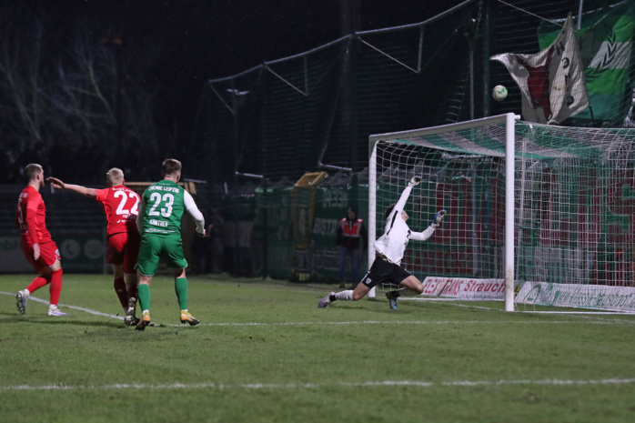 Bei einem schnellen Babelsberger Angriff kommt der Ball über Rico Gladrow und Tahsin Cakmak leicht halbrechts auf Matthias Steinborn, der zieht an der Strafraumgrenze Richtung langes Eck ab, wo die Kugel flach zum Ausgleich einschlägt. In der 28. Minute hatte der ehemalige Lok-Kicker noch eine Riesenchance liegenlassen, als er mutterseelenallein an Chemie-Keeper Benjamin Bellot scheiterte.
