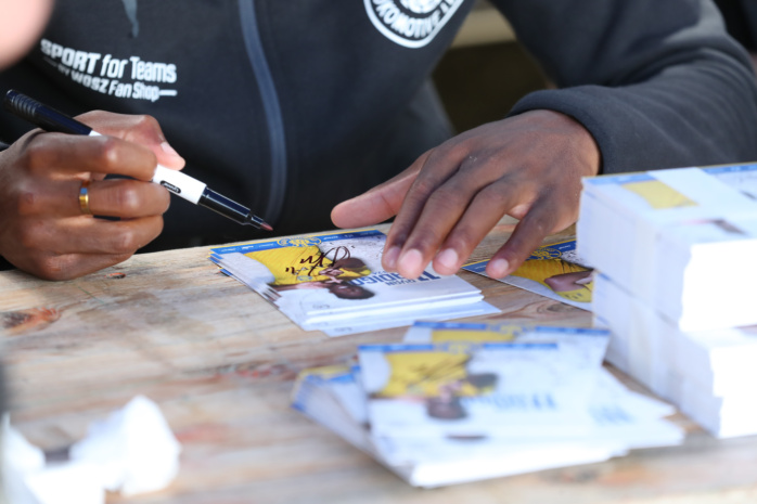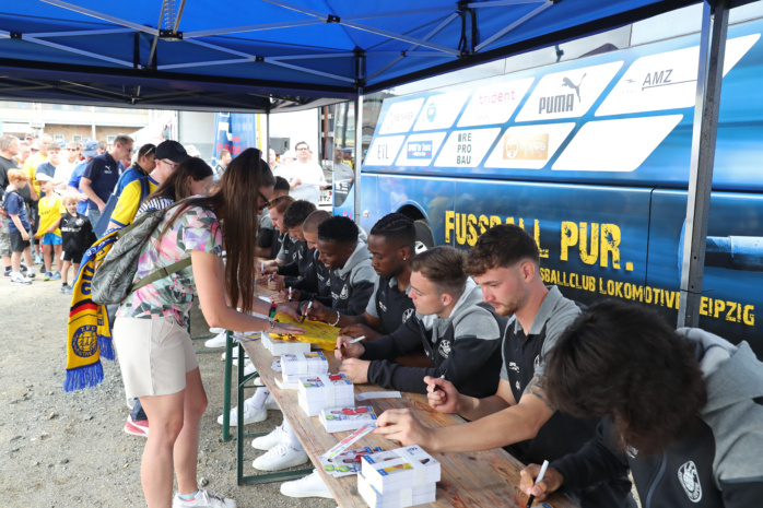 Schon lange, bevor überhaupt auch nur ein Lok-Kicker zu erspähen war, bildete sich eine rund 100 Meter lange Schlange vor Bühne und Autogramm-Tisch. Doch ehe die Spieler ihre Stifte über Autogrammkarten, Fotos, Schals, Trikots, Bälle und sonstige Devotionalien kreisen ließen, wurde jeder einzelne von ihnen auf die Bühne geholt und den Fans vorgestellt – mancher Schmunzler und großer Applaus inklusive.