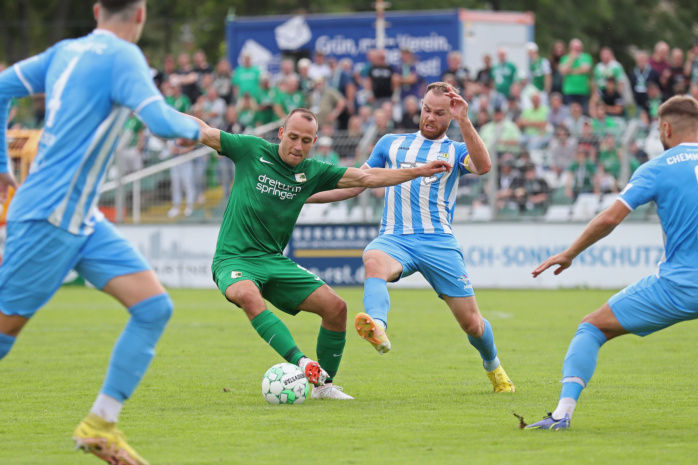 Brügmann hatte nach einer Viertelstunde Spielzeit aus der eigenen Hälfte einen Angriff eingeleitet. Seinen langen Pass entlang der rechten Außenbahn ließ Kirstein per Kopf direkt auf Hilßner abtropfen. Der läuft mit dem Ball am Fuß beherzt in Richtung Zentrum und wird dabei von zwei Chemnitzern nur halbherzig attackiert.