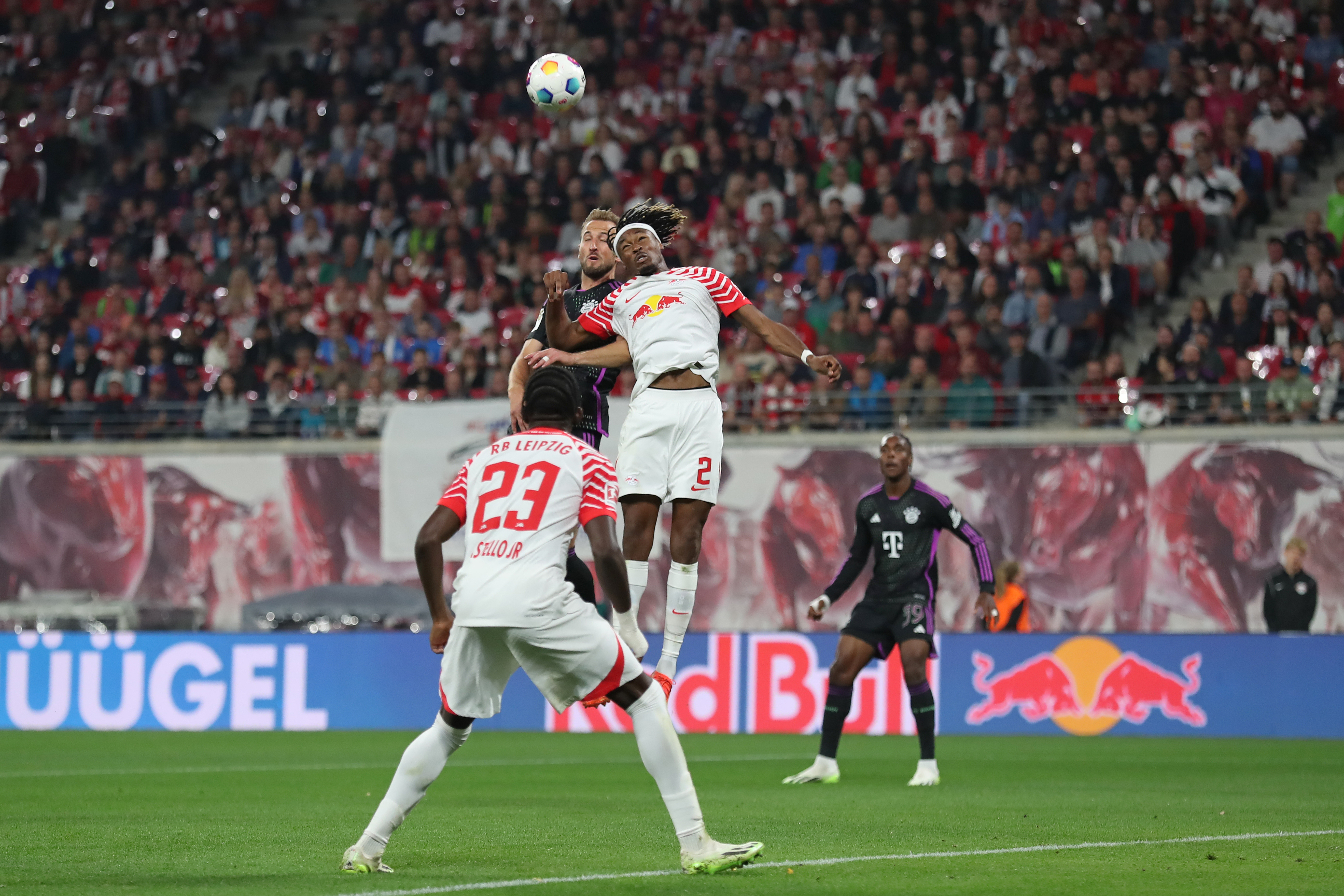 Harry Kane (9, FC Bayern) und Mohamed Simakan (2, RB Leipzig) im Kopfballduell. Foto: Jan Kaefer