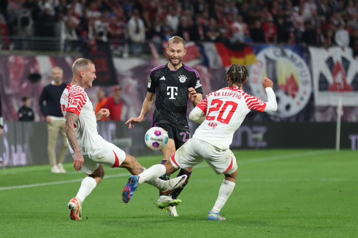 Konrad Laimer (27, FC Bayern) gegen David Raum (22, RB Leipzig) und Xavi Simons (20, RB Leipzig). Foto: Jan Kaefer