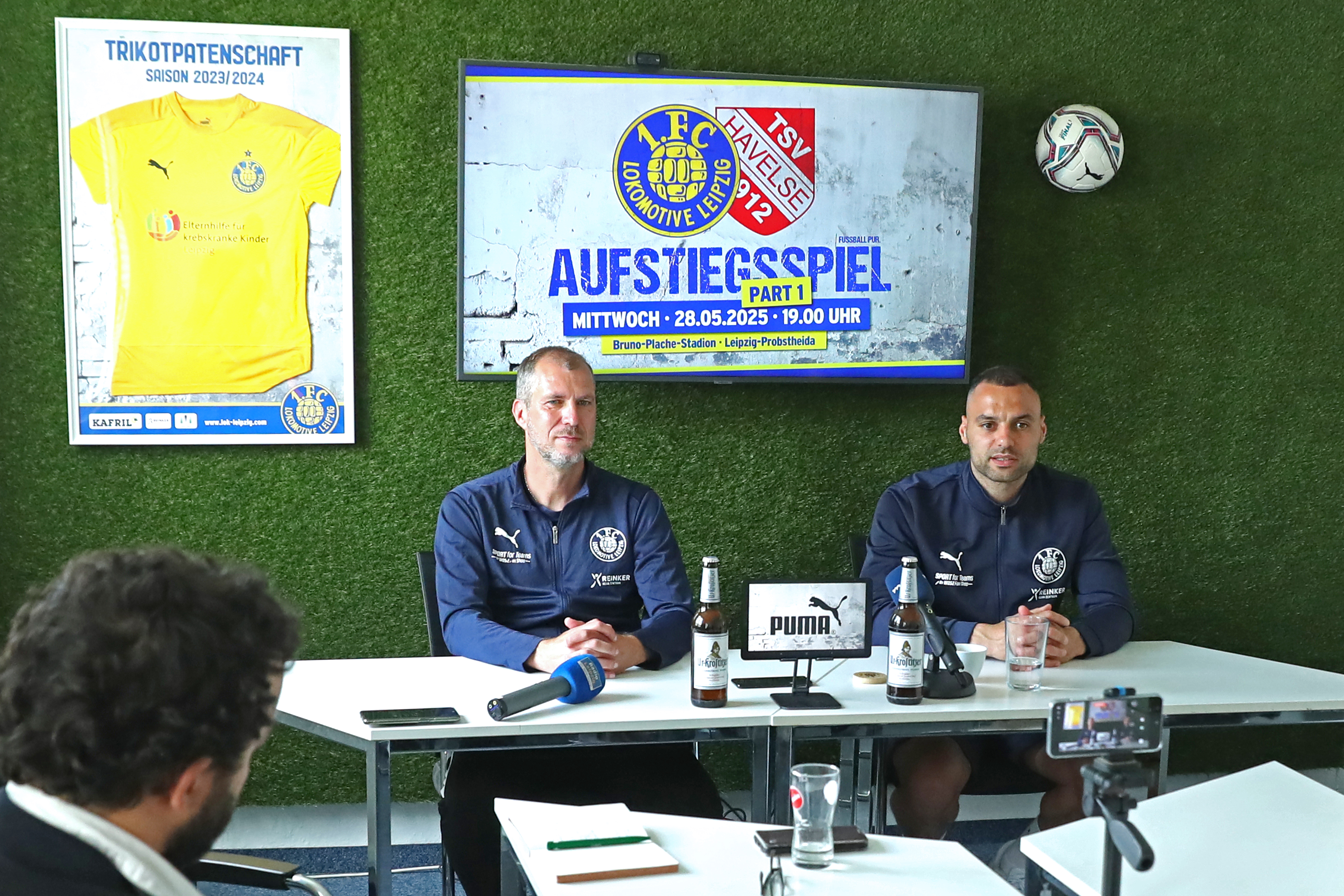 Cheftrainer Jochen Seitz (Lok Leipzig) und Kapitän Djamal Ziane (13, Lok Leipzig) beim Pressegespräch vor dem ersten Relegationsspiel gegen TSV Havelse. Foto: Jan Kaefer