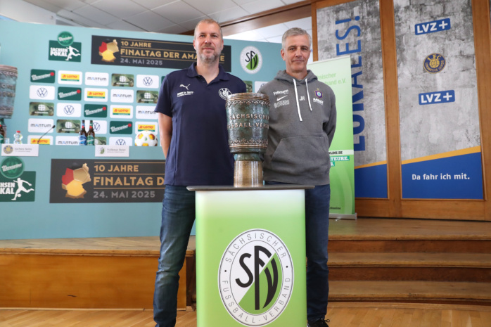 Unter den wachsamen Blicken des Sächsischen Fußball-Verbandes (SFV) durften beide Trainer schon einmal Tuchfühlung zum begehrten Pokal aufnehmen. Jubelnd in die Luft recken wird ihn nach dem Finale am kommenden Samstag aber nur einer von ihnen. Zur Vorab-Pressekonferenz am Mittwoch äußerten sowohl Lok-Coach Jochen Seitz als auch Aue-Trainer Jens Härtel großes Interesse an der Trophäe, zeigten aber auch viel Respekt vor den Fähigkeiten des jeweils anderen Teams.