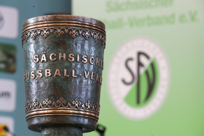 Der Sachsenpokal mit dem Logo des Sächsischen Fußball-Verbandes im Hintergrund. Foto: Jan Kaefer