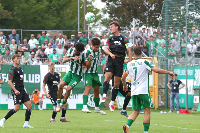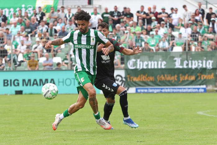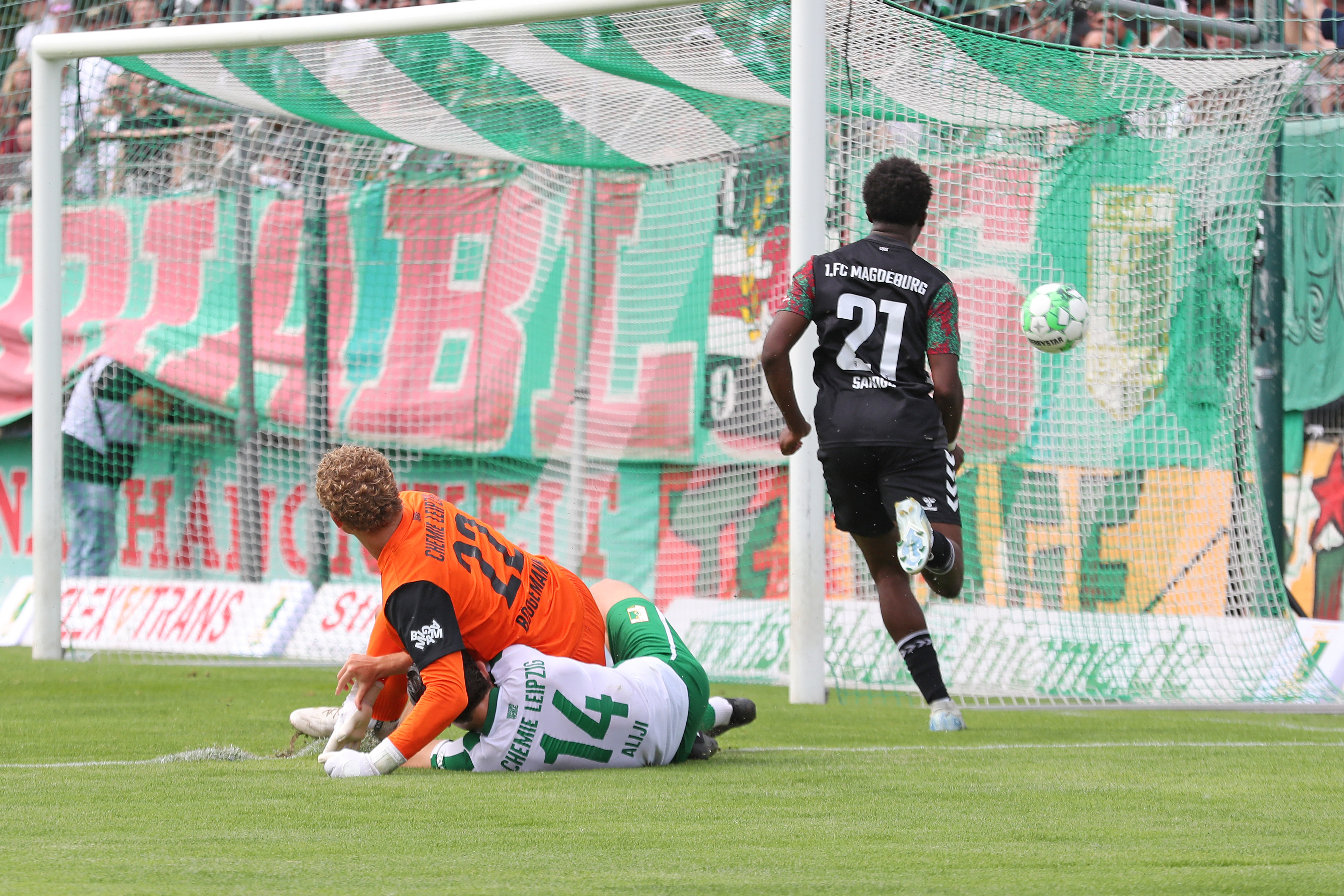 Denn schon in der siebten Spielminute musste Chemie-Keeper Luca Böggemann mit starkem Reflex die Arme ausfahren, als Enis Bytyqi kurz vor dem Strafraum den Torwinkel anvisiert hatte. Noch knapper wurde es in Minute 18, als Malick Sanogo den Chemie-Rückkehrer Phillipp Wendt auf der rechten Seite schwindlig spielte und den Ball aus spitzem Winkel an den Außenpfosten setzte.