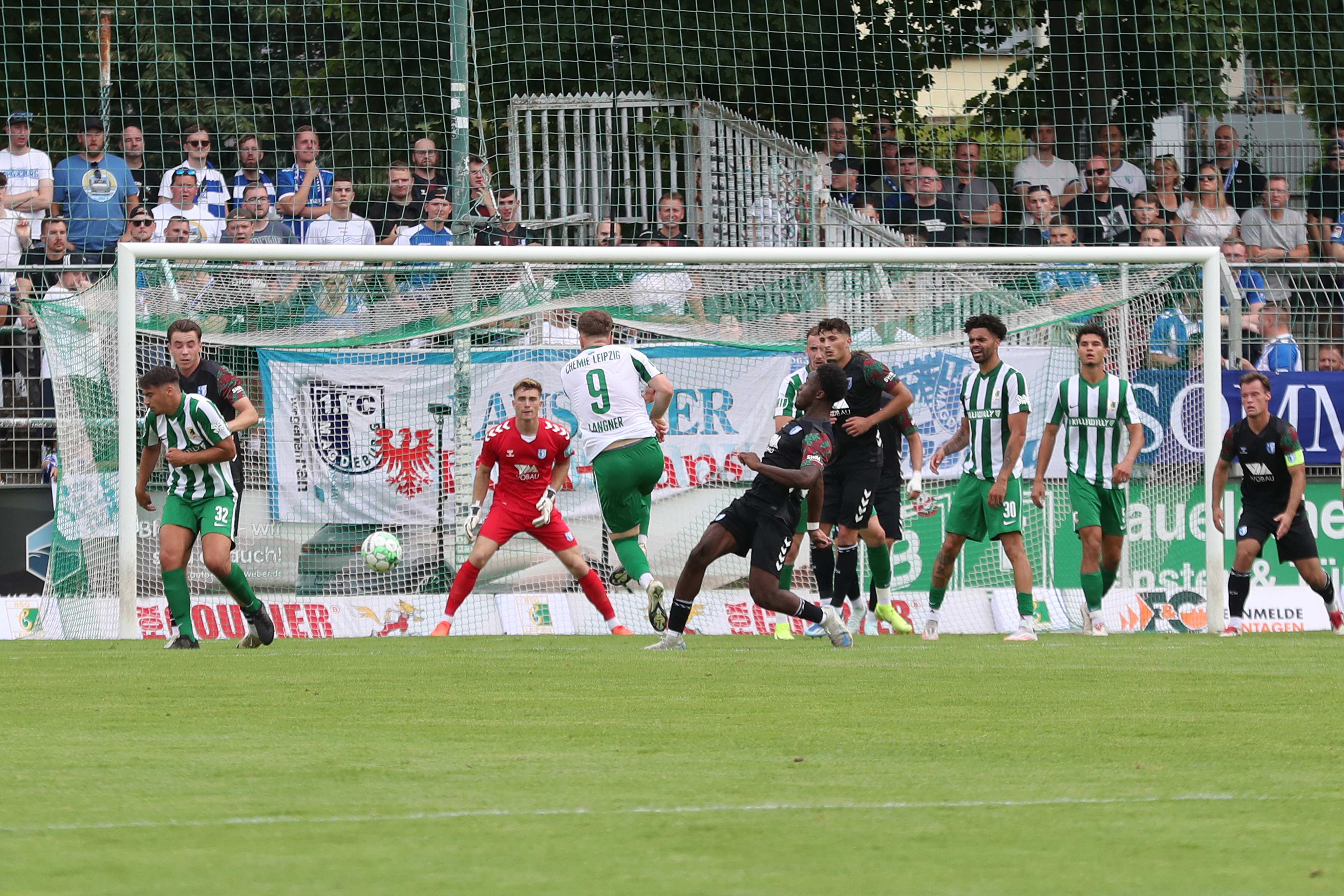 Trotzdem hatten auch die Grün-Weißen ihre Möglichkeiten. Doch ein verheißungsvoller Flachschuss aus 19 Metern von Stanley Ratifo kam zu zentral genau auf den Torhüter (21. min). Und in der Nachspielzeit der ersten Hälfte schrammte Maxime Langner nur wenige Zentimeter an einem Traumtor vorbei, als er den Ball im Anschluss an eine Ecke volley nahm. So stand zur Pause auf beiden Seiten die Null, und die 4.999 Zuschauer waren weiterhin guter Dinge.