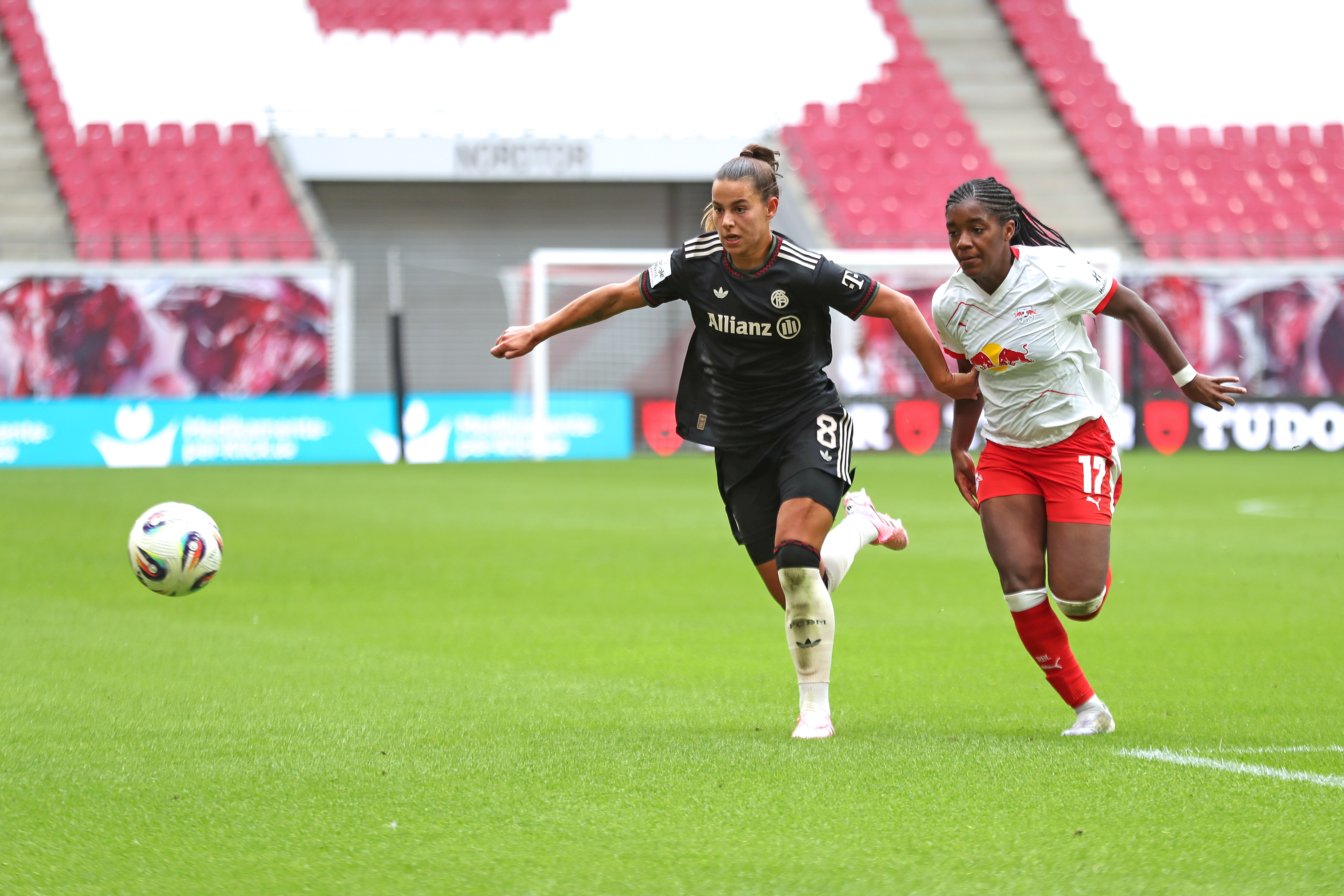 Lena Oberdorf (8, Bayern München) gegen Delice Boboy (17, RB Leipzig). Foto: Jan Kaefer