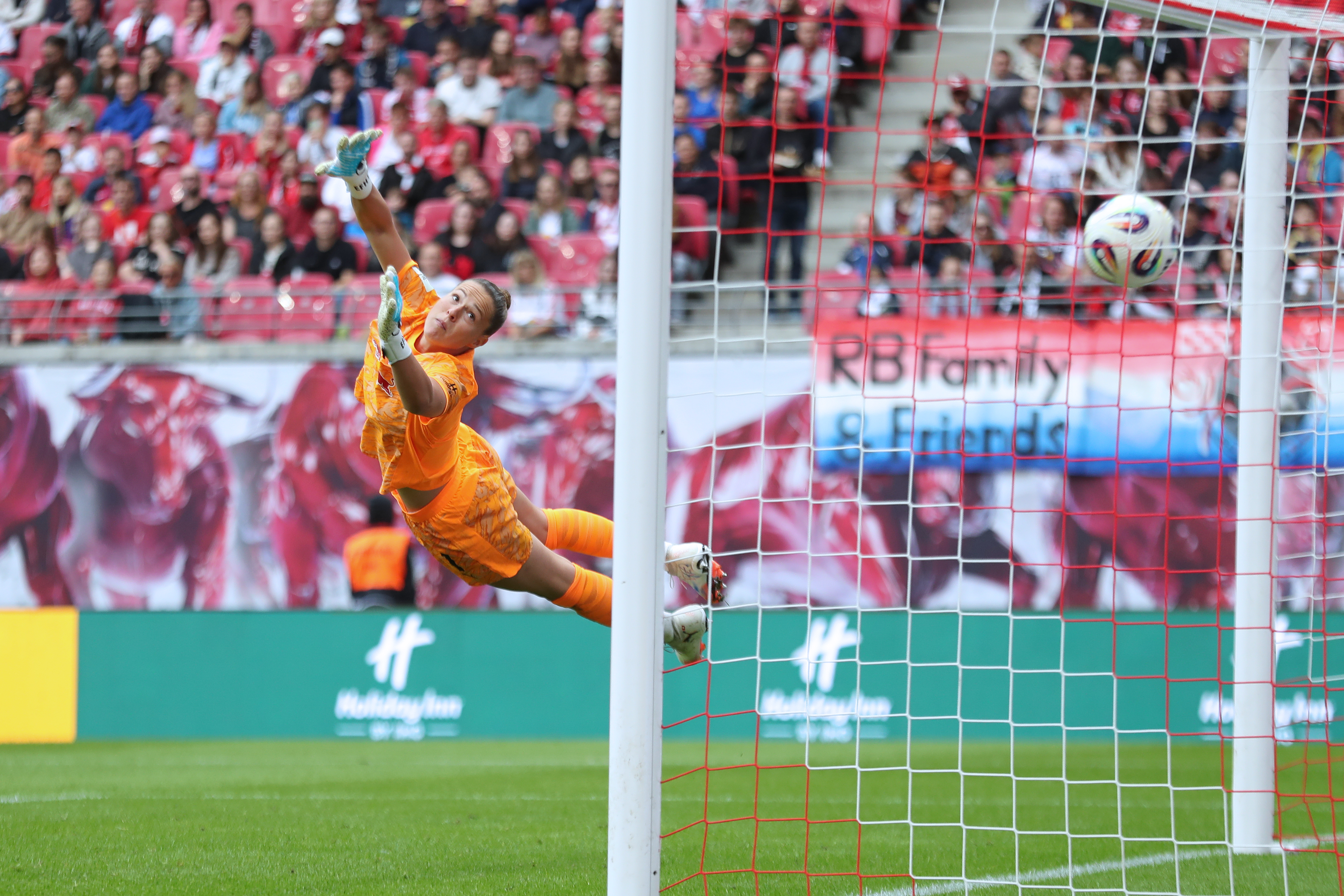 Torwart Elvira Herzog (1, RB Leipzig) fliegt vergeblich, der Ball schlägt zum 0:2 für Bayern München im Tor ein. Foto: Jan Kaefer