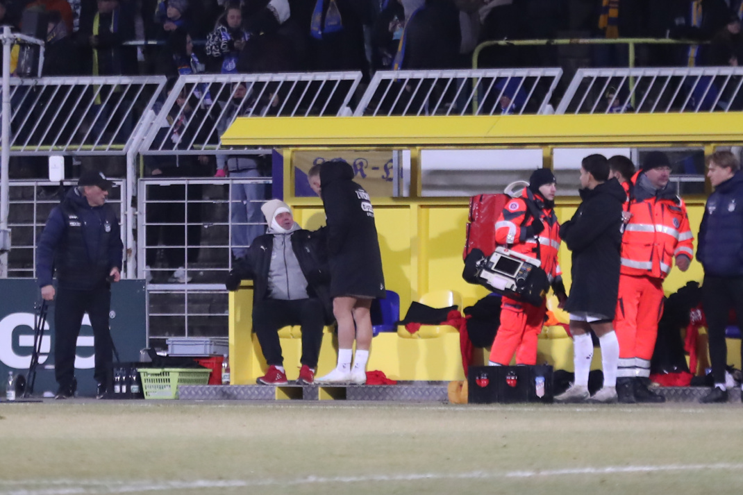 Die Zwickauer Auswechselspieler und Betreuer waren von ihrer Bank aufgesprungen. Man sah mehrere von ihnen eine Person stützen und vorsichtig unter das schützende Dach der Mannschaftsbank führen. Rettungssanitäter eilten zu Hilfe. Schiedsrichter Lukas Pilz unterbrach die Partie. Der Stadionsprecher forderte die Zuschauer energisch auf, das Werfen von Gegenständen zu unterlassen.