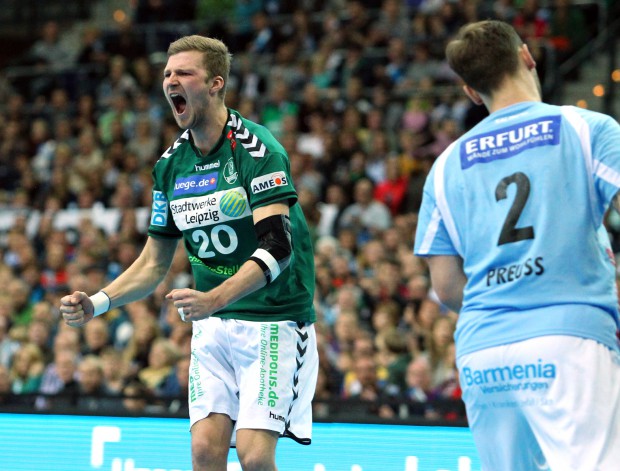 Schon die erste Viertelstunde machte deutlich, dass sich beide Teams nichts schenken würden. Die Gäste punkteten zuverlässig aus dem Rückraum, die Leipziger glichen immer wieder aus und hatten Probleme genau diese Rückraum-Angriffe zu unterbinden. Ab der 16. Minute wirkte das Angriffsspiel etwas fahrig, Ballverluste und technische Fehler brachten die Hausherren etwas um den Spielfluss. Es folgten einige Wechsel von Christian Prokop zum Beispiel auf der Kreisläufer-Position, wo Benjamin Meschke für Alen Milosevic übernahm. Ziemlich schnell machte sich dieser Wechsel bemerkbar, denn Meschke traf gleich zweimal gegen seinen ehemaligen Verein.