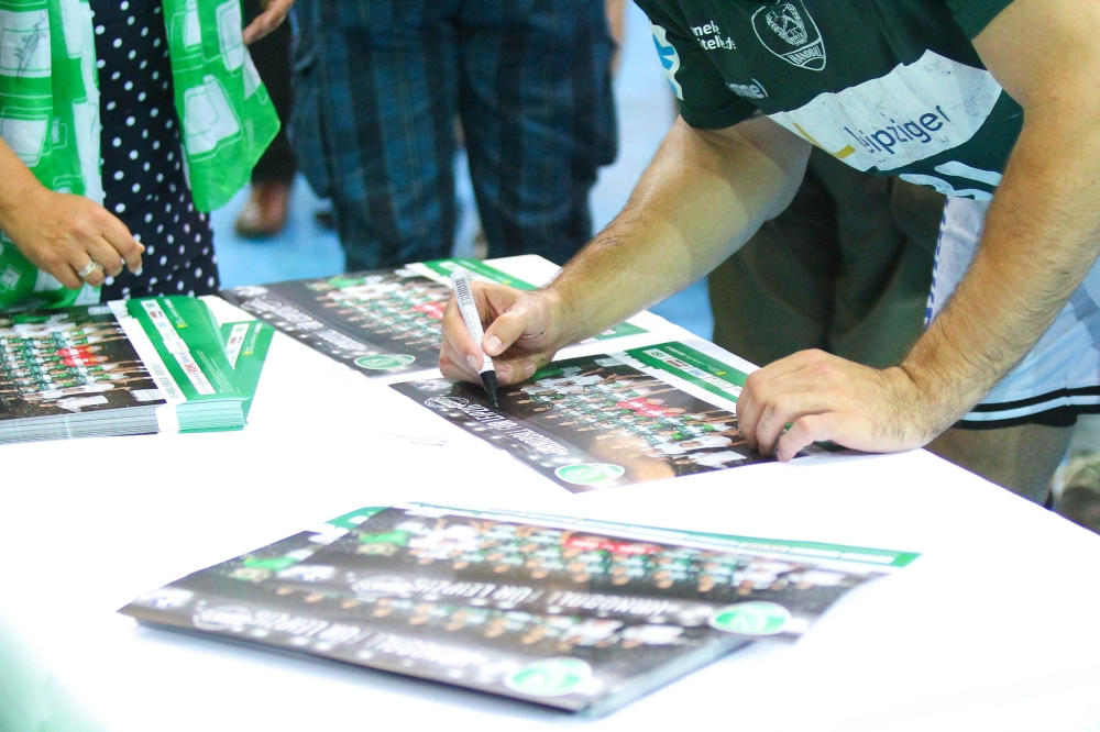 Im Anschluss an die Partie schrieben die Bundesliga-Handballer für die Fans Autogramme. Foto: Jan Kaefer