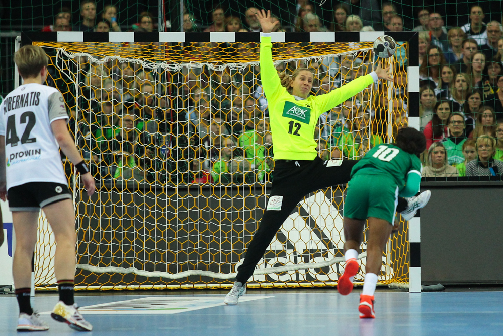Die Ex-Leipzigerin Katja Kramarczyk pariert einen Siebenmeter von Yolande Touba Byolo. Foto: Jan Kaefer