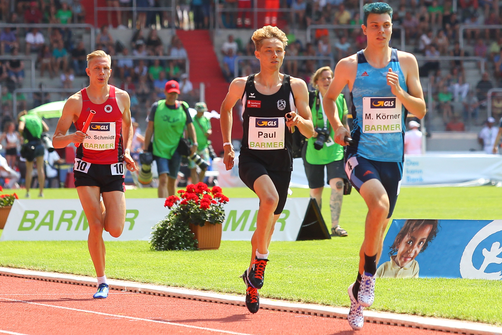 Die Schlussläufer Vincent Paul (SC DHfK Leipzig) und Max Körner (StG LAC Erfurt) müssen den Dresdner Jonathan Schmidt (li.) noch vorbeiziehen lassen. Foto: Jan Kaefer
