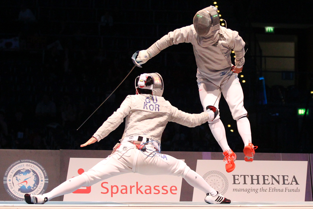 Die weltbesten Fechter waren im Sommer hautnah in der Arena Leipzig zu erleben. Eine Woche lang kämpften diese mit Degen, Florett und Säbel um die WM-Medaillen. Besonders in den Finalduellen gab es auf der Planche spektakuläre Aktionen zu bestaunen. Ein Beispiel dafür zeigt dieses Foto, das am 24. Juli im Team-Finale der Säbel-Männer entstand. Der Südkoreaner Bongil Gu attackiert den Ungarn Aron Szilagyr, der mit einem Luftsprung selbst den Treffer setzen will.