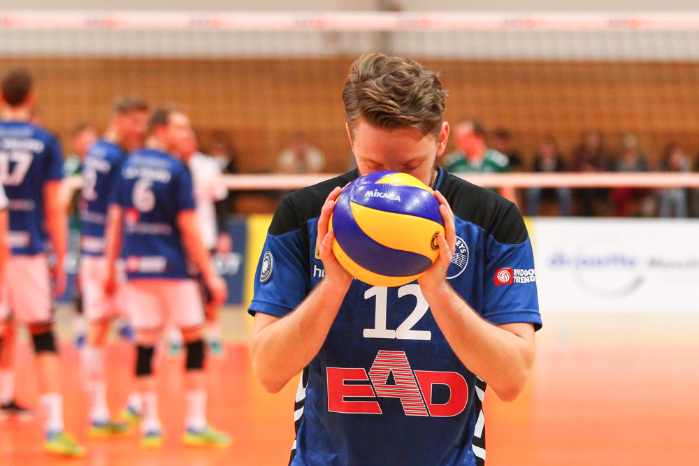 Was wäre das für eine großartige Fähigkeit, in der Lage zu sein, einem Ball intensiv einzuflüstern, wohin er zu fliegen hat. Im Bild versucht das Martin Burgartz im Spiel gegen FT 1844 Freiburg (14.10.2017). Am Ende vergebens. Die Leipziger verloren 0:3 und sammelten in der restlichen Hinrunde zu viele weitere Niederlagen ein. Der Klassenerhalt in der 2. Volleyball-Bundesliga wackelt bedrohlich. Doch wer weiß, vielleicht klappen die Einflüsterungen in der Rückrunde besser...