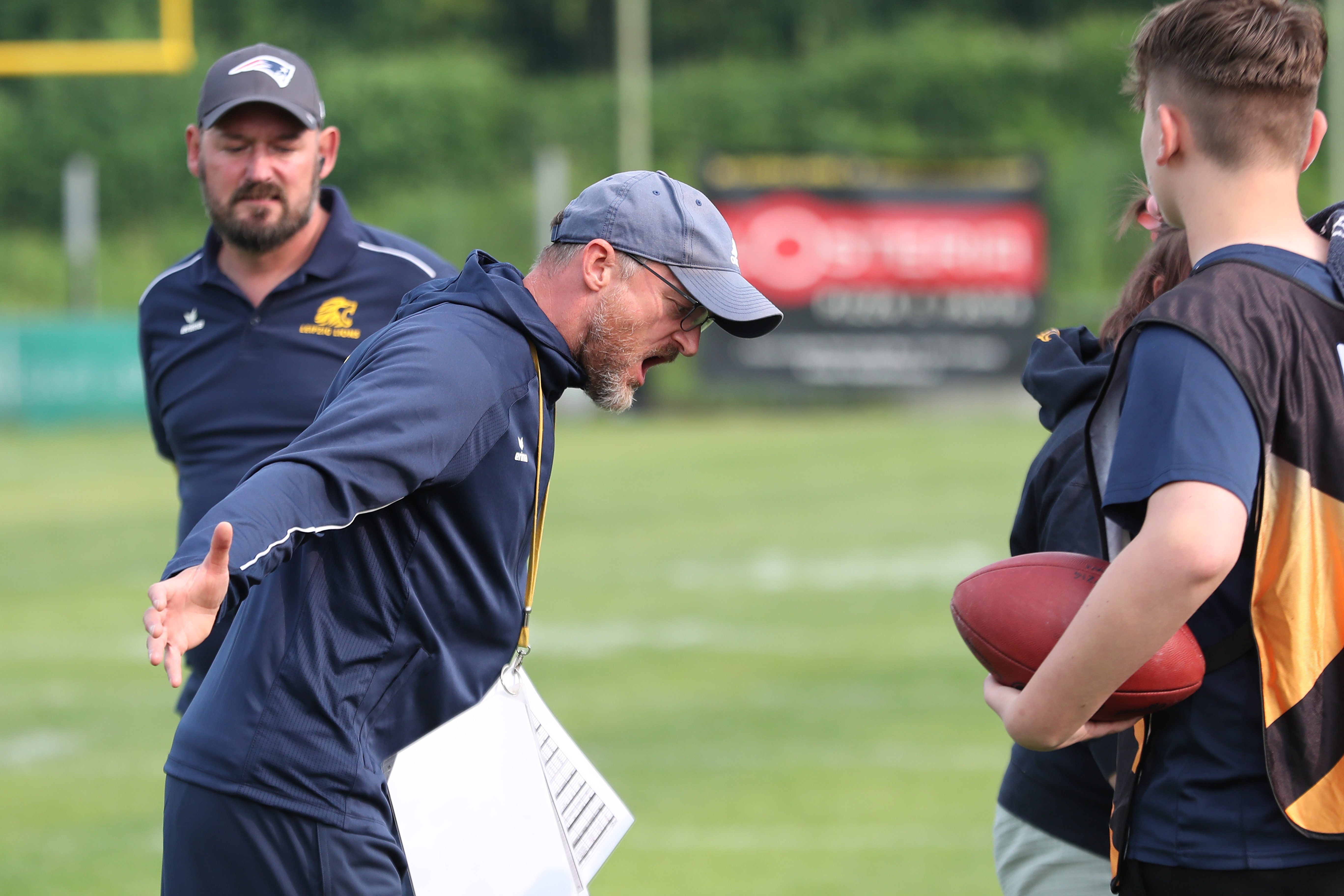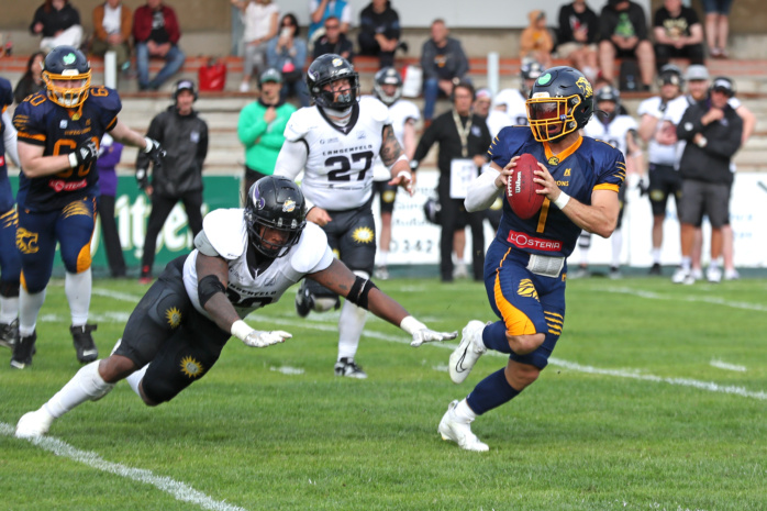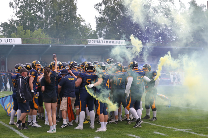 „Insgesamt bin ich mit der Performance unserer Mannschaft sehr zufrieden. Die Moral ist da, und die Emotionen sind da, auch wenn wir die noch ein bisschen in positive Energien kanalisieren müssen.“ Denn dass sein Team das zweite Heimspiel im Markkleeberger Ugi-Sportpark gegen den Spitzenreiter so lange offenhalten konnte, war – vor allem auch mit Blick auf dessen starke Offensive Line – nicht unbedingt zu erwarten gewesen.