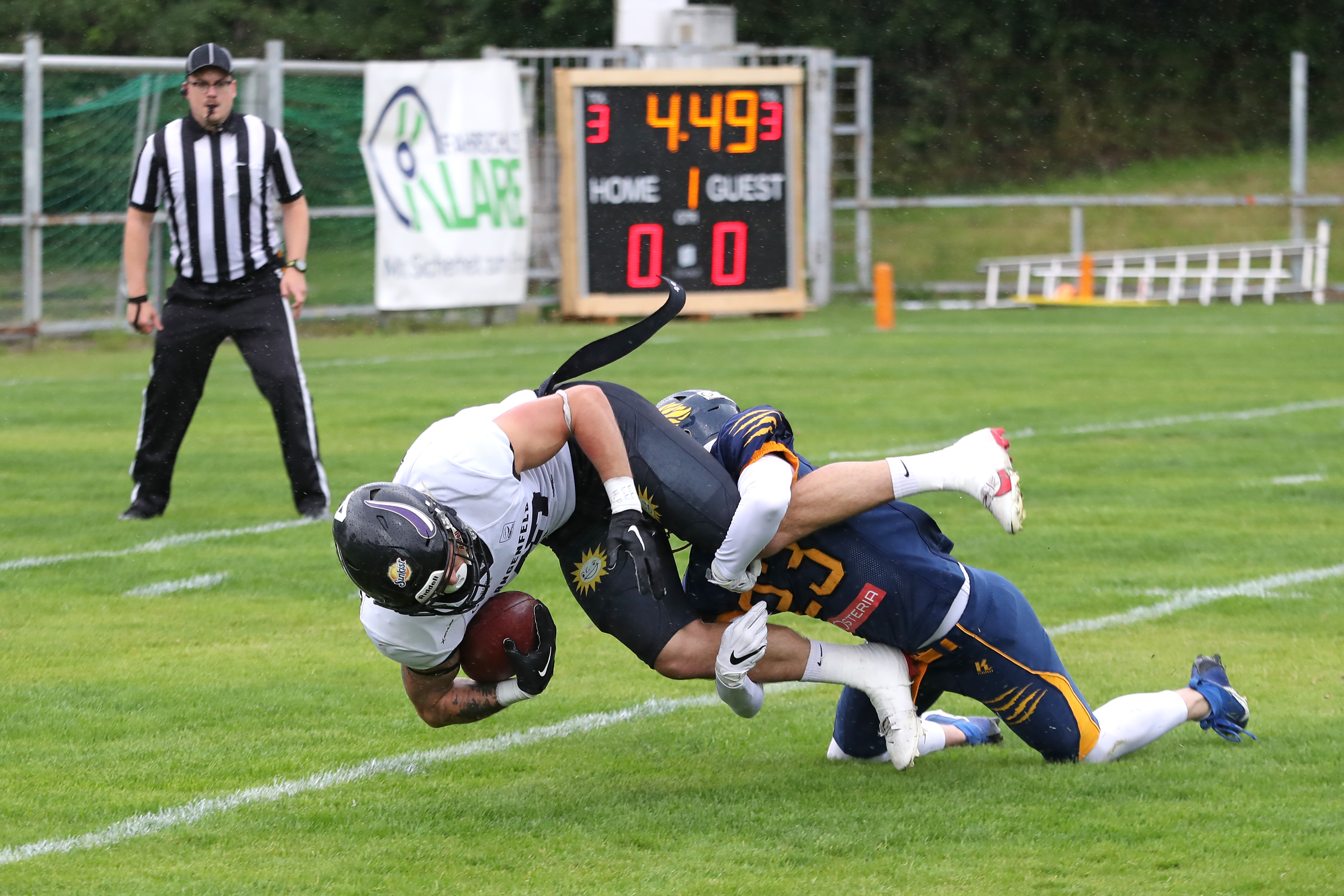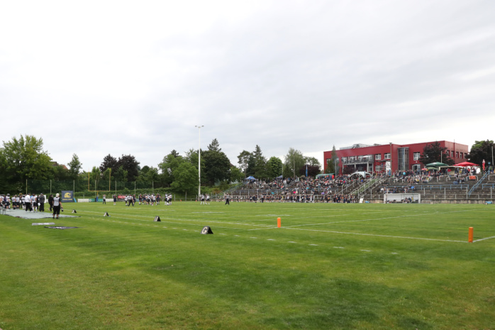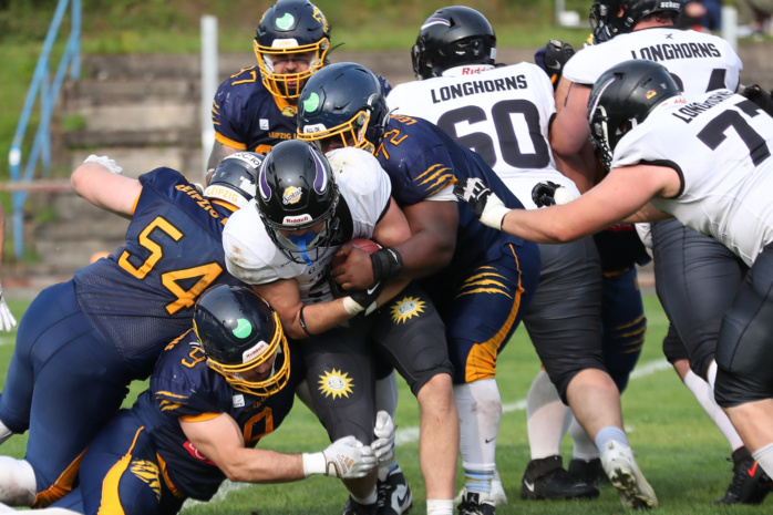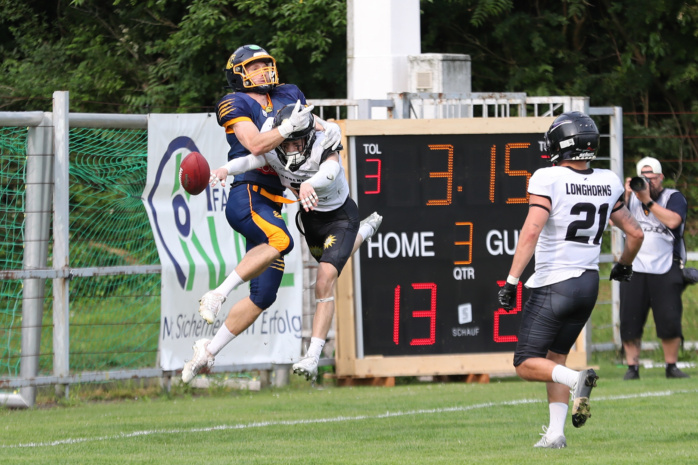 „Bisher war es meist zum Ende des zweiten Quarter, wo die Gegner schnell einfache Punkte machen konnten“, erinnerte sich Headcoach Kunz ungern. Aber: „Das konnten wir diesmal verhindern.“ Zwar zauberte Langenfeld bis zum Pausentee doch noch einen Touchdown auf den Rasen, aber bei einem 13:21 war noch vieles möglich.