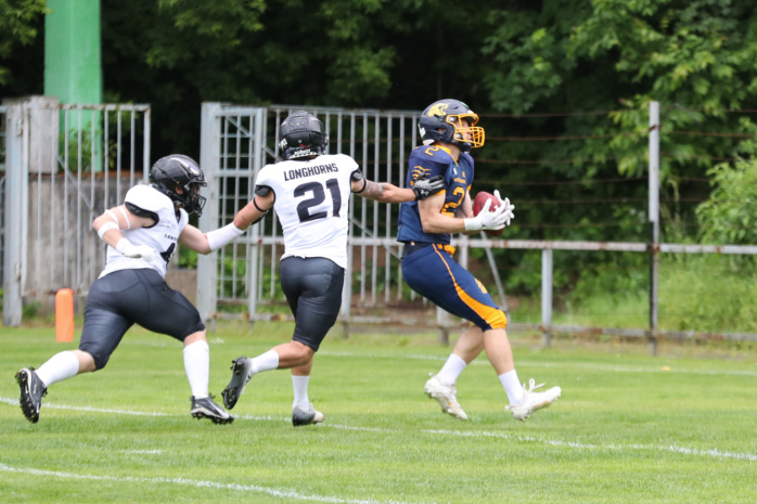Es war schon tief im ersten Quarter, bis die Langenfeld Longhorns überhaupt erstmals die Leipziger Reihen überwinden konnten und in Führung gingen. Das schockte die Lions nicht. Wenig später konnten sie per Pass von Elliot Bodman auf Jan Eisenbraun ausgleichen, sodass es auf Augenhöhe mit 7:7 ins zweite Viertel ging.