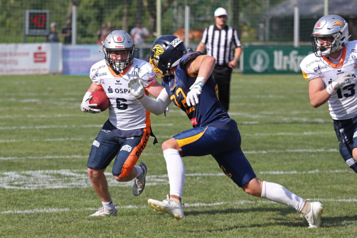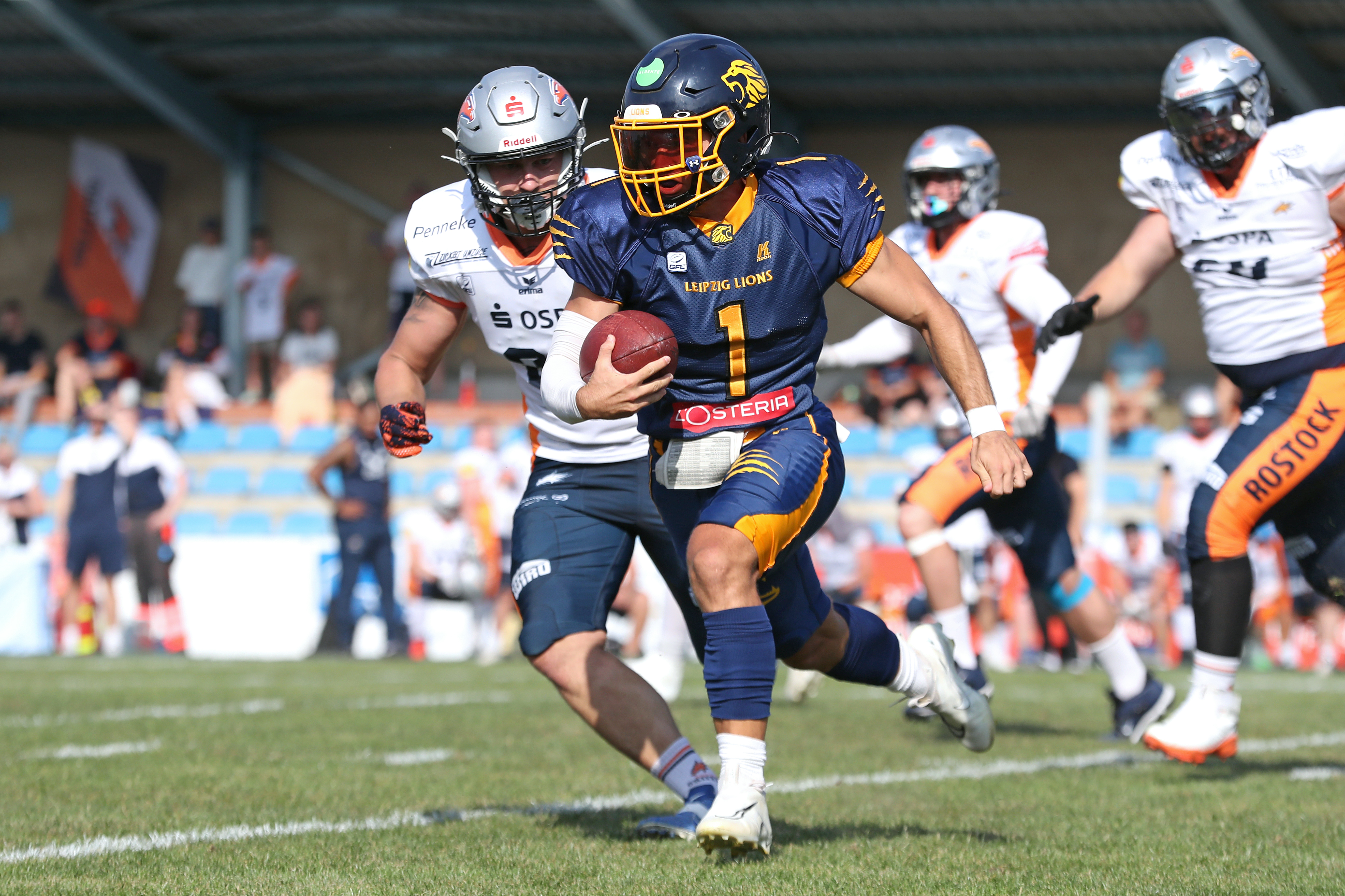 Den Fans auf der Tribüne blieben die Münder offenstehen, als vier Sekunden vor Ultimo Lions-Quarterback Elliot Bodman einen lang und länger werdenden Pass nach vorne katapultierte, wo Jan Eisenbraun den Ball über Umwege tatsächlich zu fassen bekam. Keine zwei Meter vor der Ziellinie! Doch bevor er zum finalen Lauf ansetzen konnte, rannte ihn der heranstürmende Rostocker Dennis Wuchrer entschlossen über den Haufen.