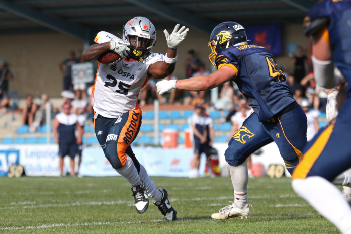 Dabei schien zunächst alles den erwarteten Verlauf zu nehmen. Zwar konnten die Leipziger, die bisher erst zwei Siege auf der Haben-Seite hatten, gegen den Favoriten aus Rostock – bisher sechs Siege – durch ein Field Goal in Führung gehen, zur Halbzeit lagen die Gastgeber jedoch mit 10:22 zurück. Das ist an sich noch keine unaufholbare Differenz, aber gegen den Spitzenreiter zumindest eine ehrgeizige Mission.