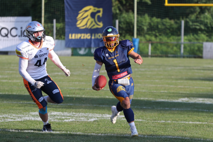 Elliot Bodman (#1, QB, Leipzig Lions) mit einem Lauf. Foto: Jan Kaefer