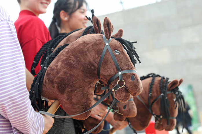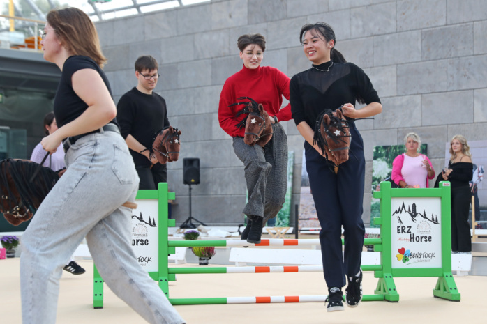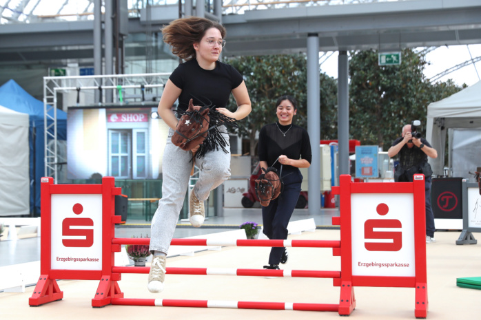 Mitten in der lichtdurchfluteten Glashalle hat der Reit- und Fahrverein Eibenstock 1930 e.V. die Wettkampfflächen für den „Hobby Cup“ aufgebaut. Sieht aus wie beim echten Reitsport, nur ein paar Nummern kleiner. Denn beim Hobby Horsing benötigen die Pferde nur sehr wenig Platz. Sie bestehen ja lediglich aus einem Plüschkopf, der auf einem Stecken befestigt ist. Entsprechend müssen die meist sehr jungen Sportlerinnen und Sportler den Wettbewerb auch auf den eigenen Beinen absolvieren.