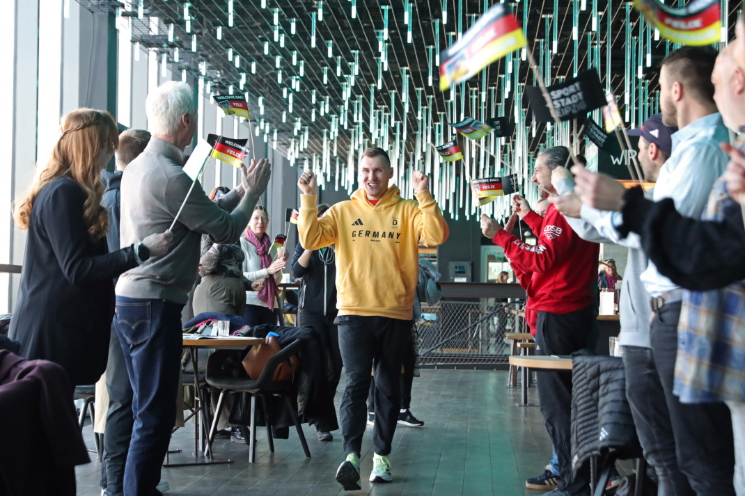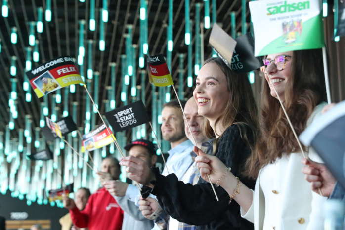 Applaus und Jubel branden auf, als Felix Straub am Mittwoch das Restaurant Felix am Augustusplatz betritt. Fähnchenschwenkend bilden ihm Freunde und Wegbegleiter ein Spalier, durch das der Olympiaheld freudestrahlend schreitet und die warme Dusche aus positiven Emotionen genießt. Auch Sportbürgermeister Heiko Rosenthal, Polizeipräsident René Demmler, SC DHfK-Präsident Bernd Merbitz, der Liebertwolkwitzer Ortsvorsteher Roland Geistert und Olympia-Reporter Tom Scheunemann waren gekommen, um dem erfolgreichen Sportler persönlich zu gratulieren.