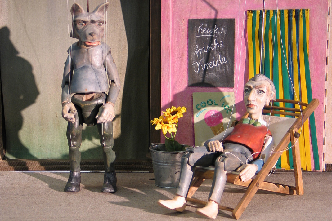 Aber wenn er dann doch die kleinen Geißlein mit Haut und Haaren herunterschlingt, ist alles wieder wie im Märchen der Brüder Grimm: Die Geißlein kommen lebend heraus aus dem Wolfswanst und der Übeltäter fällt in den Brunnen.