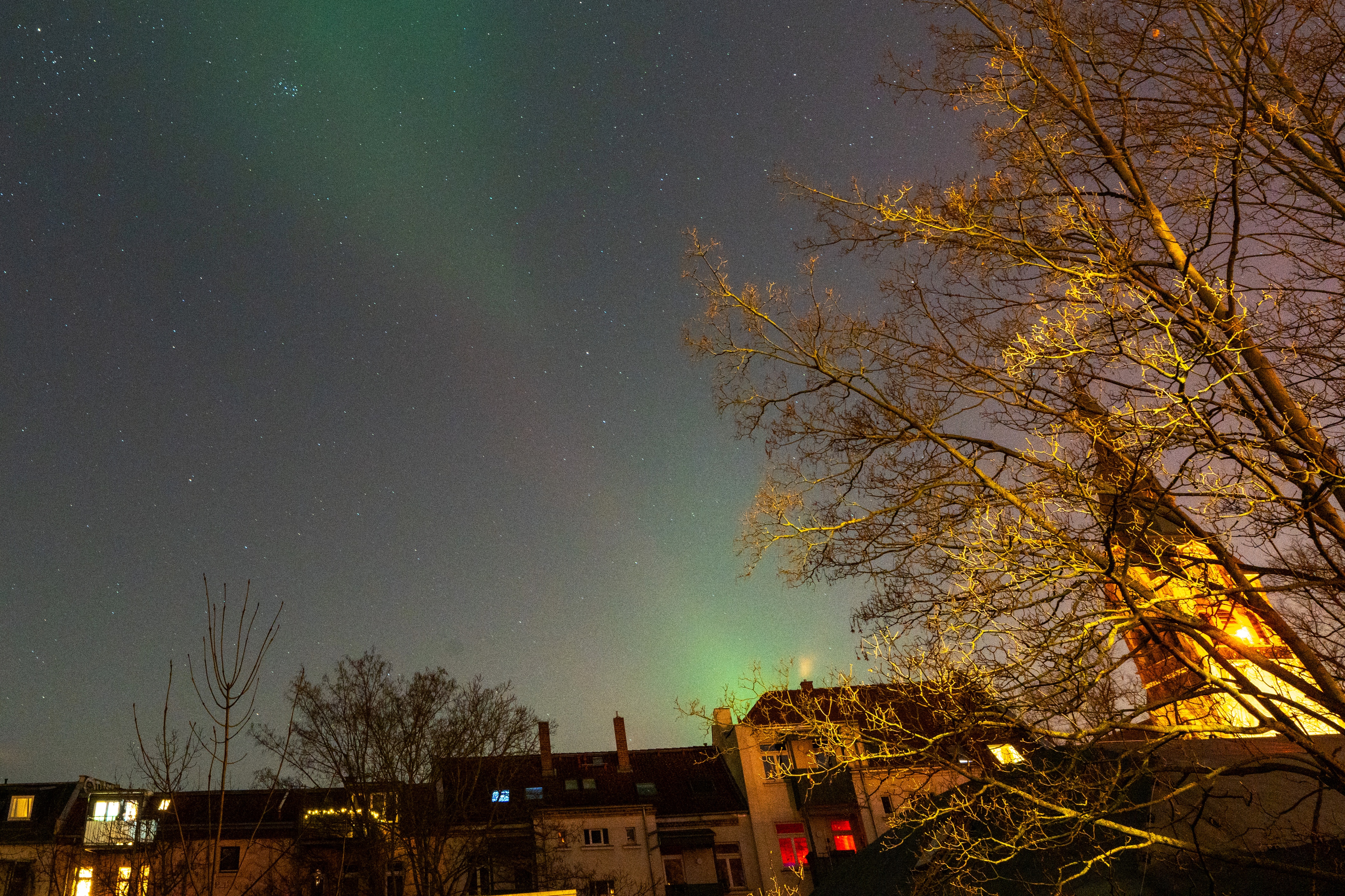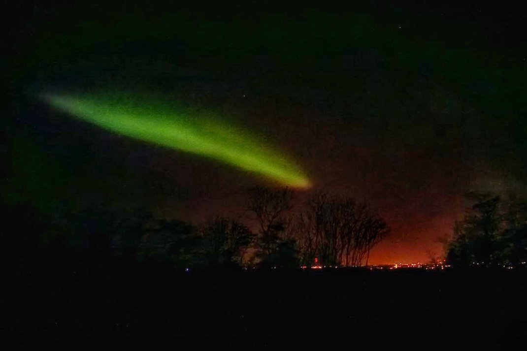 Der aktuelle Sonnensturm war so kräftig, dass er den „Staub“  bis weit in unsere Region drückte. Je nach Art der Teilchen entstehen auf diese Weise unterschiedliche Farben. Sauerstoff leuchtet rot und grün, Stickstoff blau bis violett.
