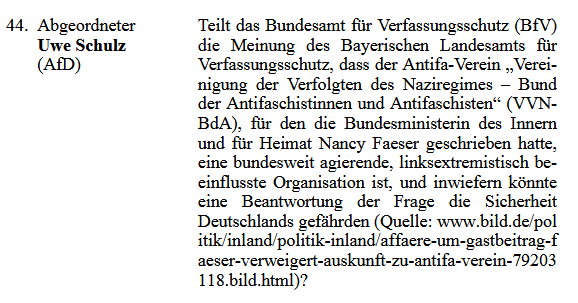 In der Anfrage (Quelle Bundestag 08.04.2024, Seite 36) wird nicht etwa ein Link zum Bayerischen Landesamt für Verfassungsschutz gesetzt, um die Behauptung zu begründen, sondern zu einem BILD-Artikel. In diesem ist das auch nicht näher ausgeführt. Beim BayLfV ist dazu eine Textstelle zu finden. In dieser wird aber nicht der VVN-BdA als linksextremistisch, schon gar nicht als Antifa-Verein, bezeichnet. Es heißt dort: „Auch auf die Vereinigung der Verfolgten des Naziregimes – Bund der Antifaschistinnen und Antifaschisten (VVN-BdA) übt die DKP durch Mitarbeit Einfluss aus.“ Das ist schon etwas Anderes.