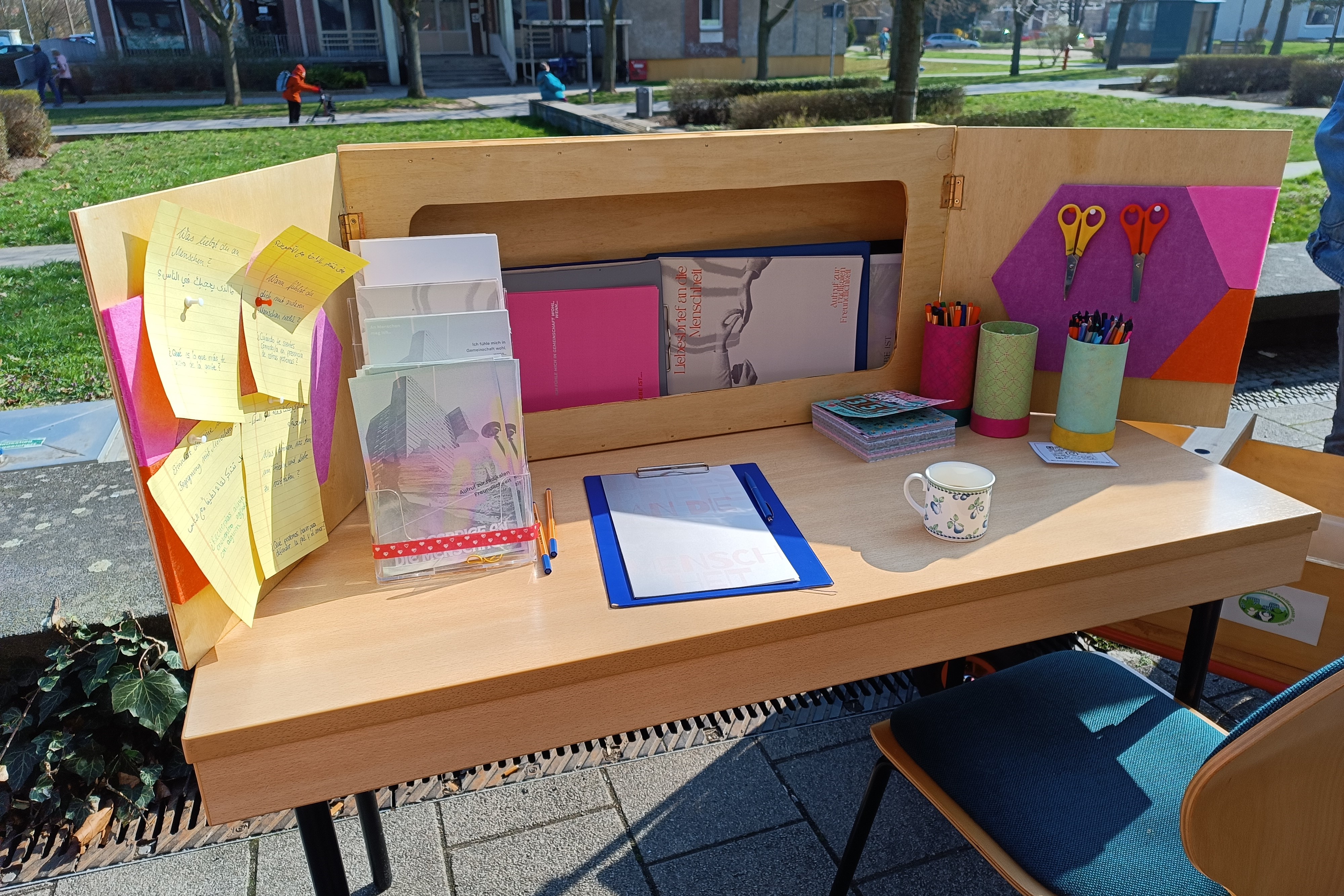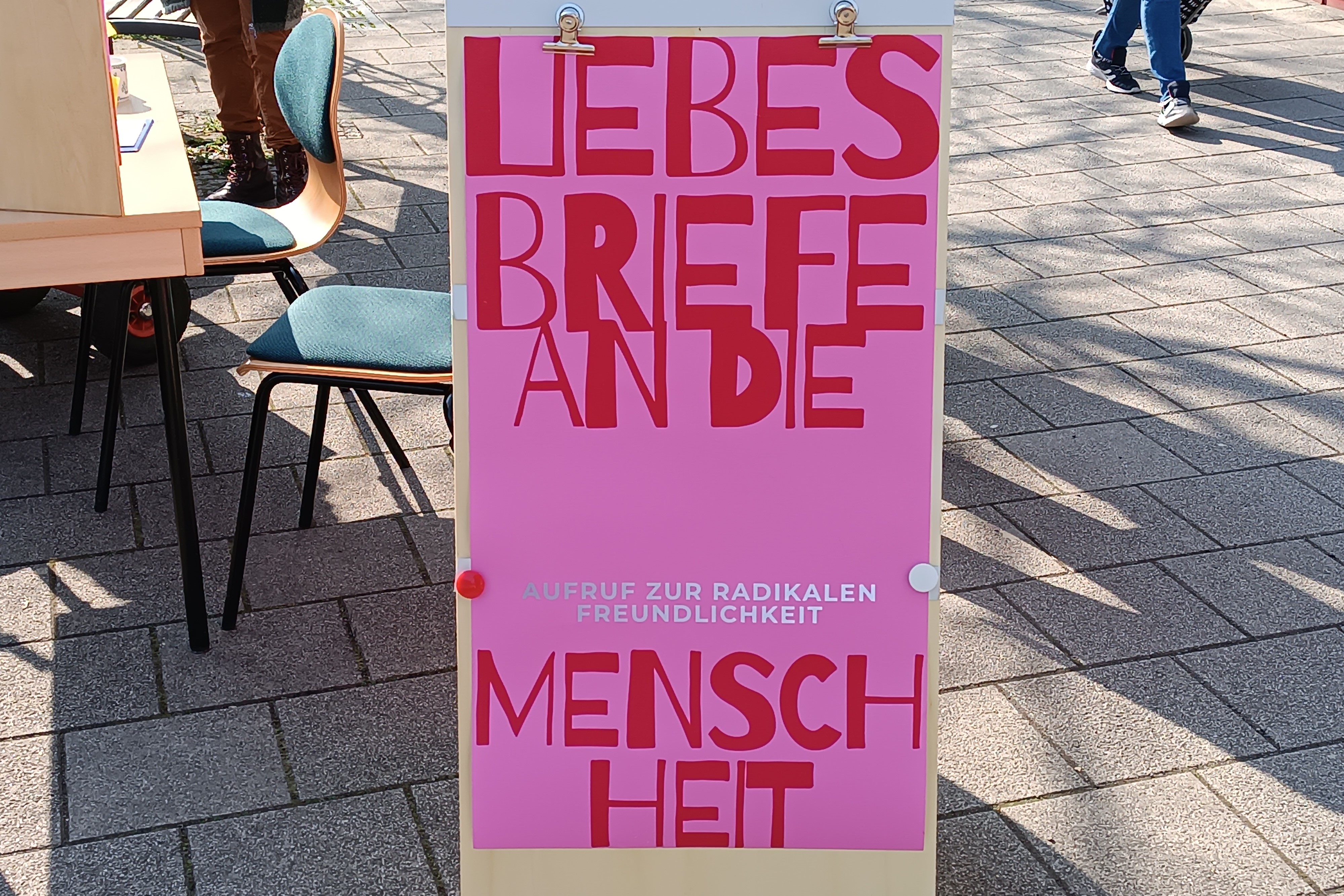 Die Aktion läuft unter dem Motto „Liebesbriefe an die Menschheit und das Miteinander – ein Aufruf zur radikalen Freundlichkeit“ und das Konzept ist einfach erklärt. Es gibt den Stand mit dem Postamt, es gibt Briefpapier mit dem Motto, es gibt Kaffee und Menschen können sich hinsetzen und einen Brief über ihre Gedanken und Gefühle zum Thema schreiben.
