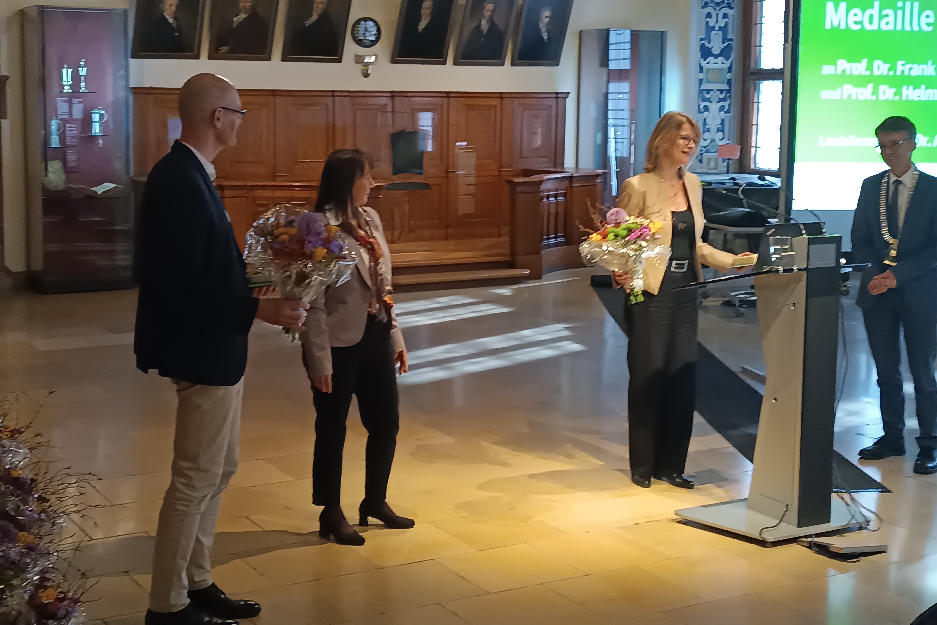 Es folgten zwei Preisverleihungen. Die Wilhelm-Ostwald-Medaille, die in Anerkennung besonderer wissenschaftlicher Leistungen vorwiegend auf dem Gebiet der Natur- und der Ingenieurwissenschaften verliehen wird, wurde in diesem Jahr an zwei Preisträger vergeben. Prof. Dr. Helma Wennemers von der ETH Zürich und Prof. Dr. Frank Glorius von der Universität Münster wurden für ihre bahnbrechenden Arbeiten auf dem Gebiet der organischen Chemie geehrt.
