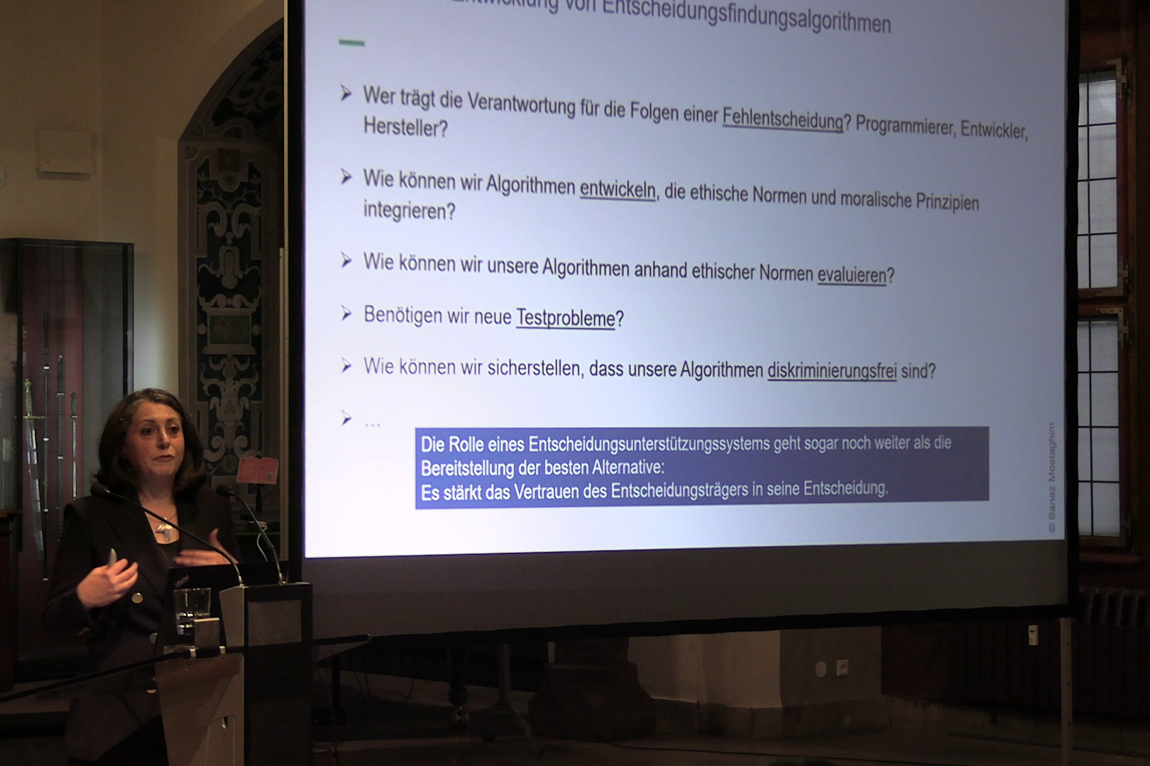 Am Ende kam die Frage, die viele Menschen bewegt: Wie ist das mit der Ethik bei KI-Entscheidungen. Nach meinem Verständnis war die Antwort: Es gibt und darf keine KI-Entscheidung geben. Diese Systeme sind Entscheidungsunterstützungssysteme, die uns helfen Entscheidungen zu treffen. Prof. Mostaghim stand einer Anfrage zwecks einem späteren Gespräch zu diesem Thema positiv gegenüber. Wir werden das also vertiefend behandeln.