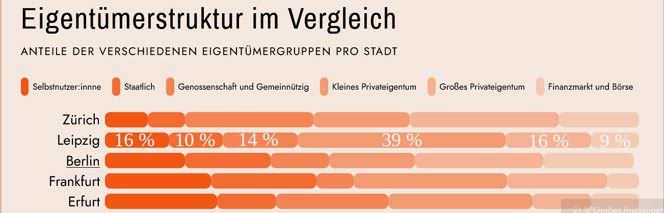 Genaue Zahlen zu finden ist schwierig, die Webseite „Wem gehört die Stadt“ bietet auf der Startseite einen guten Überblick. Wir haben die Prozentzahlen für Leipzig in der Abbildung zur Vereinfachung eingefügt.