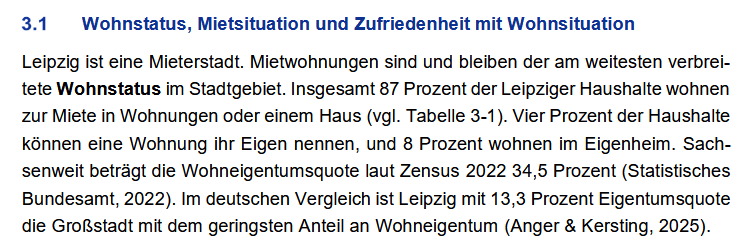 Bei der Mietenkonferenz der Linken ging es in erster Linie um einen Teil der 9 % Eigentum „Finanzmarkt und Börse“, die Vonovia SE. Entgegen der Eigendarstellung auf der Webseite gibt es immer wieder starke Kritik an Vonovia als Vermieter. Als Beispiel sei hier die Pressemitteilung des Mietervereins Leipzig e. V. von 2023 „Razzia bei Vonovia: Mieterbund fordert lückenlose Aufklärung und transparentes Handeln“ angeführt.