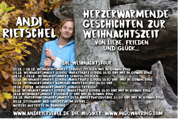 Bald nun ist Weihnachtszeit. In einer Woche beginnt die Adventszeit. Andi Rietschel, Dj, Geschichtenerzähler und Friedensaktivist aus Leipzig ist dann wieder unterwegs mit Geschichten und Märchen junge, alte und mittelalte Menschen auf Weihnachtsmärkten und anderswo zu erfreuen.