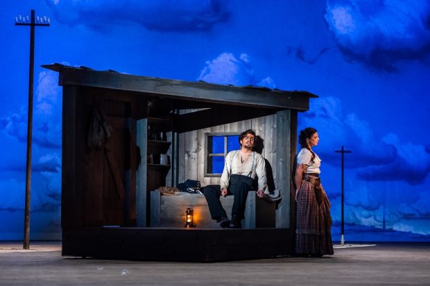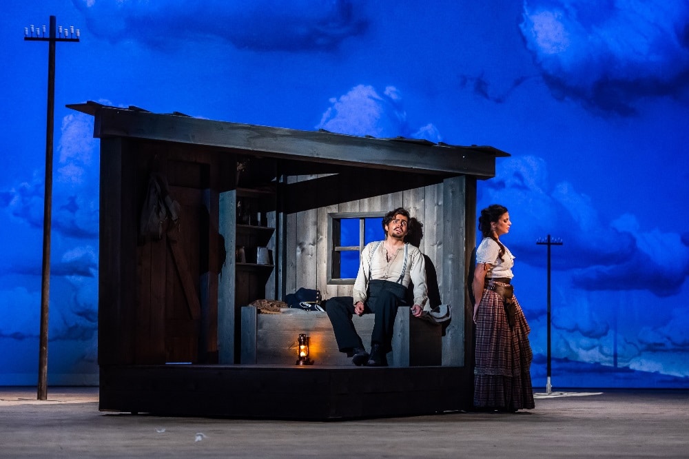 Rolando Villazón wagt in seiner Inszenierung nun äußerst überzeugend die Verlegung der Handlung an das Filmset eines Western-Movies der 40er Jahre und schafft ein Spiel im Spiel. Am Filmset soll der Italo-Western »The Wild, Wild Girl« gedreht werden – mit Adina und Belcore in den Hauptrollen. Dulcamare ist der Regisseur und gibt – unterstützt von Regieassistentin Giannetta – im Film den Arzt.
