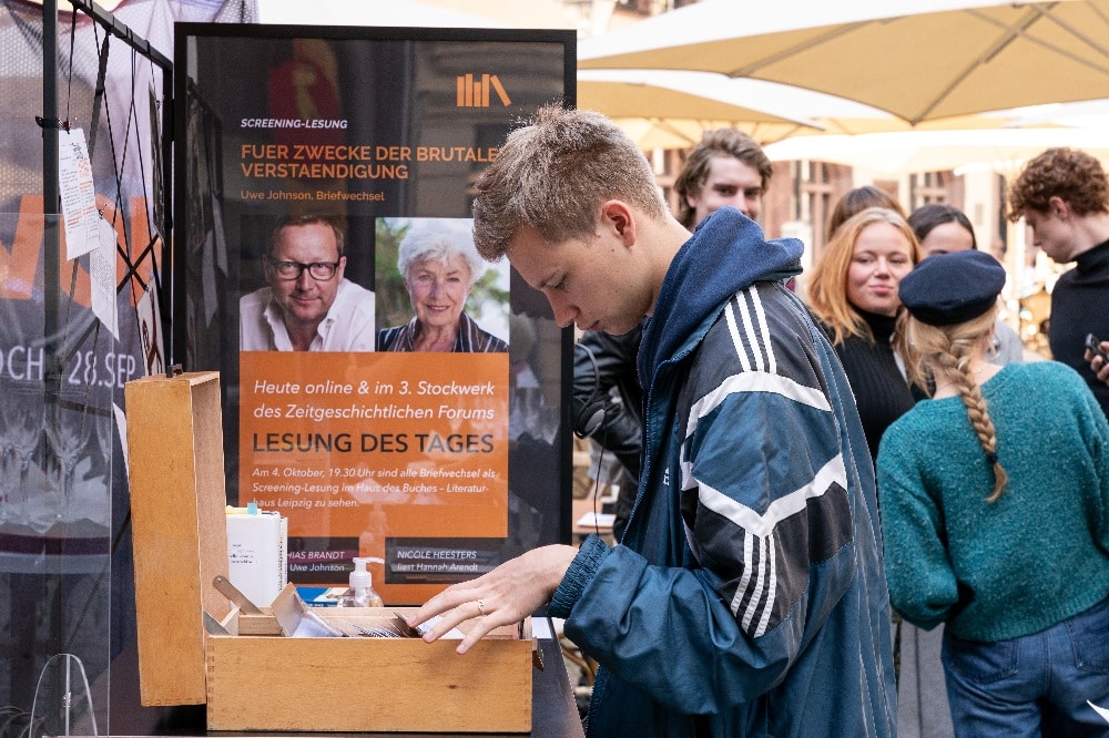 Im Theaterparcours im Stadtarchiv (1.-3.10.) erleben die Zuschauer:innen drei unterschiedlich inszenierte Welten mit Uwe Johnsons Prosa. Den Abschluss der Festivalwoche bildet eine hochkarätig besetzten Screening-Lesung im Literaturhaus Leipzig, in der Johnsons Briefwechsel von u.a. Matthias Brandt, Jutta Hoffmann und Charly Hübner am 4.10. im Video gelesen werden.