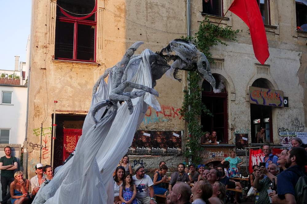 Mit dem Walkact Die Riesin Esra ist erwacht und treibt ihr Unwesen und dem Miniaturtheater Lambe Lambe nimmt der Westflügel Leipzig am 10. und 11. Juli mit zwei Aktionen am diesjährigen Schönauer Parkfest in Leipzig-Grünau teil.