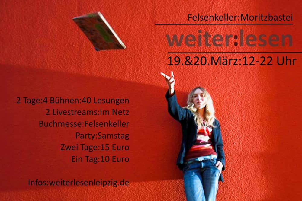 Unter dem Titel „weiter:lesen 2022“ werden am 19. und 20. März 2022 mindestens 40 Lesungen Autoren, Bücherfreunde und Verlage zusammenbringen. Veranstaltungsorte sind beliebte Leipziger Kultur-Standorte wie die Moritzbastei und der Felsenkeller. Alle Lesungen finden mit Publikum statt.