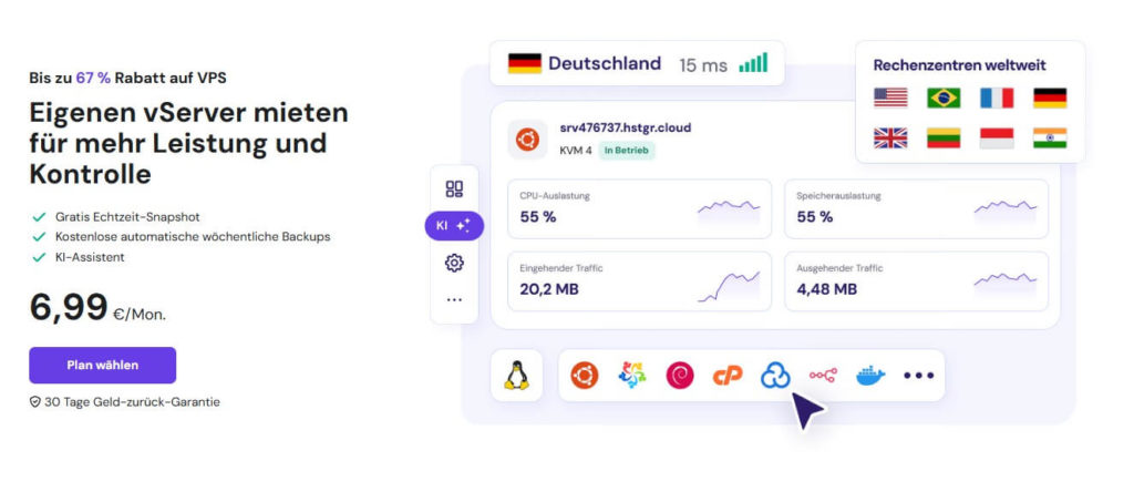 Hostinger VPS ist eine leistungsstarke & kosteneffiziente VPS-Lösung für 2025 – ideal für Entwickler, anspruchsvolle Websites, kleine Apps oder Gaming-Server. Die KVM-Technologie mit NVMe-SSD und LiteSpeed ergibt hohe Performance, während hPanel und AI-Assistent die Bedienung erleichtern.