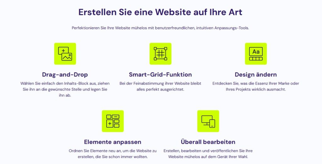 â Drag-and-Drop-Editor, ideal fĂŒr Einsteiger ohne Vorkenntnisseâ Schnelle Ladezeiten durch LiteSpeed-Server, SSD-Hosting & integriertes CDN