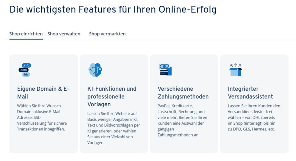 IONOS bietet drei E-Commerce-Tarife, die sich nach Funktionsumfang, Anzahl der Produkte und Zielgruppe unterscheiden. Alle Tarife beinhalten ein SSL-Zertifikat, eine Domain im ersten Jahr, E-Mail-Postfächer sowie Hosting und Support.