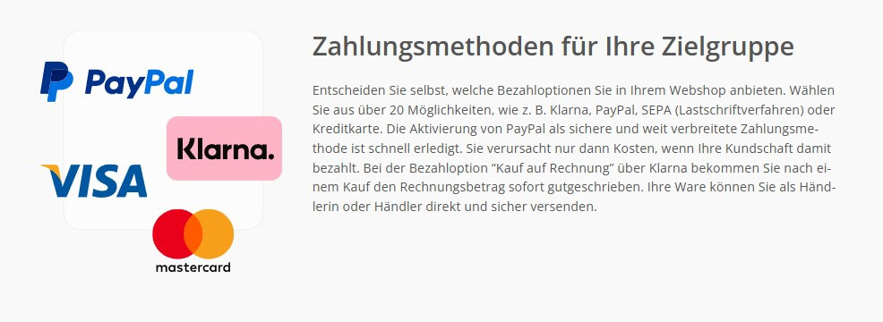 | Zahlungssysteme | PayPal, Klarna, Vorkasse, Kreditkarte |