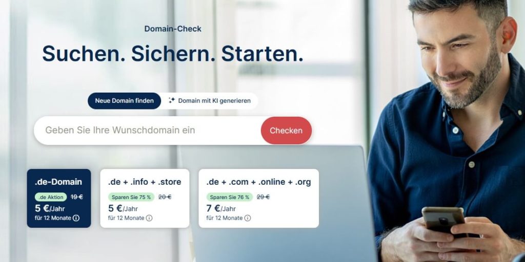 Die Preise variieren je nach TLD stark. Klassische Endungen wie .de oder .com kosten zwischen 10 € und 15 € jährlich. Neue Endungen wie .shop, .store oder .design starten bei rund 25 € pro Jahr. Die Preisstruktur ist transparent, Zusatzdienste wie E-Mail oder Webspace können optional gebucht werden.